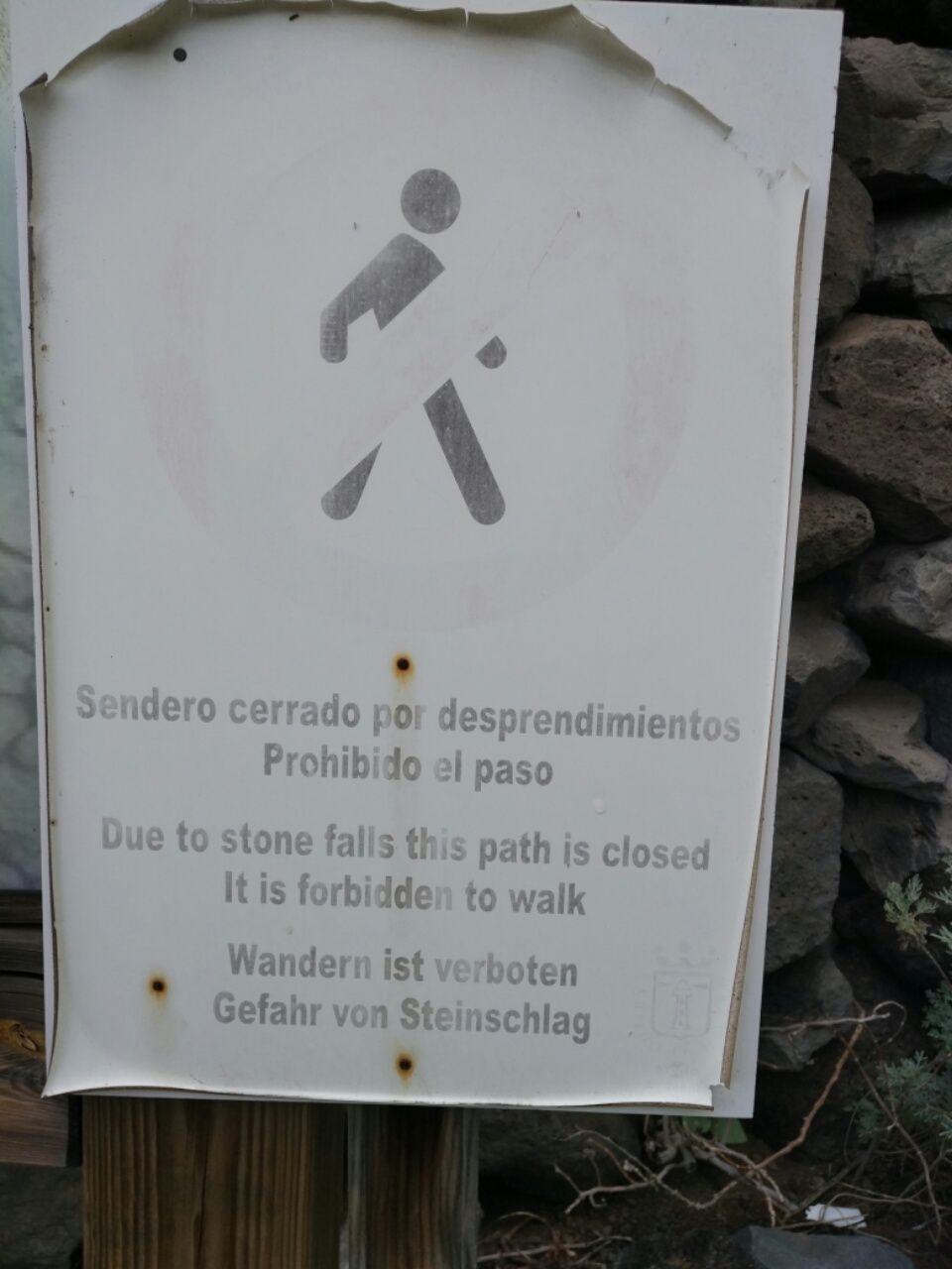 Der „Mirador da Peña“ steht immer noch auf meiner ToDo-Liste. Inzwischen habe ich herausgefunden, dass man den auch von der Hauptstraße aus begehen kann. Das Ende bzw. der Beginn dieser Wanderung liegt nur wenige Kilometer außerhalb von La Frontera. Von unten ist der Einstieg ganz einfach zu erkennen ( wenn man es weiß ). Aber mein Plan löst sich ganz schnell in Luft auf. Der Camino de la Peña ist wegen Steinschlag gesperrt, und das anscheinend schon länger, so verblichen wie die Schilder aussehen. Der Text steht dort sogar in deutscher Sprache, da kann man sich nicht dumm stellen und einfach loswandern.