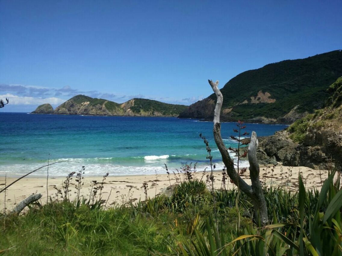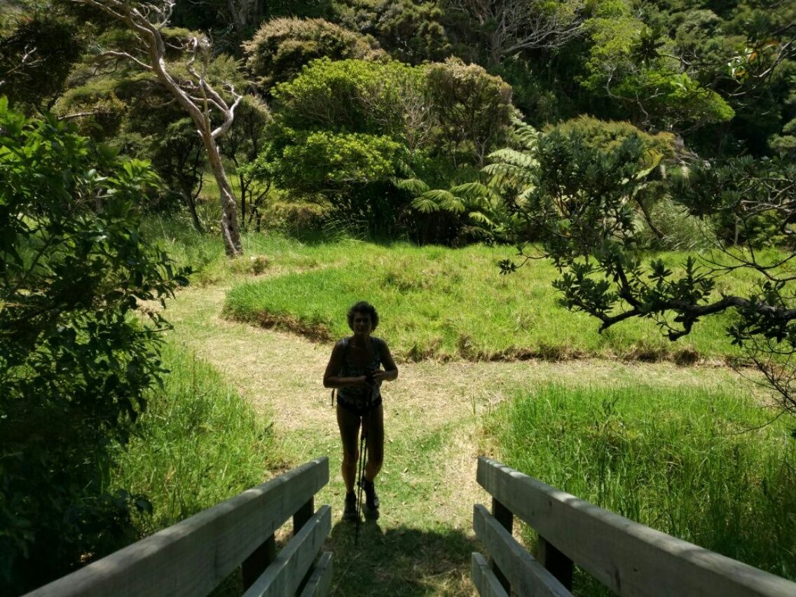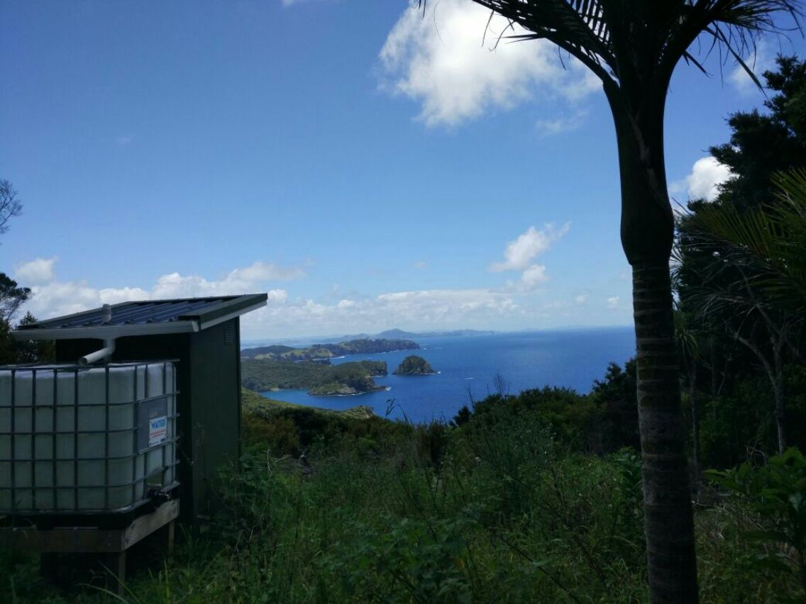 Unser Nachbar ist bereits weg, als wir aufstehen. Der wollte uns wohl nicht kennenlernen. 😉 Mit dem Dinghi paddeln wir zum Strand vor der alten Walfang-Station. Von dort aus geht es bergauf zum Cape Brett-Track. Ein richtig toller Weg durch neuseeländischen Busch über die Hügel entlang der Küste, viel besser als erwartet. Lautes Knacken in den Büschen und unheimliche Geräusche aus dem Wald lassen uns anhalten, währen wir auf schmalem Pfad entlang einer sehr zugewachsenen Strecke laufen. In dem dichten Urwald kann man leider nicht erkennen, um was für ein Tier es sich handelt, aber es muss etwas Großes sein. Es hört sich an wie ein tiefes Knurren. Diese seltsamen Töne können wir gar nicht zuordnen. Possum, Ziege, Pferd oder Kuh sind das nicht. Wir sind in Neuseeland, hier sollte es eigentlich keine wilden Tiere geben. Vielleicht ein entlaufener und verwildeter Hund ? Eher unwahrscheinlich, denn es hörte sich wirklich groß und tief an. Oder Wildschweine ? Die wurden irgendwann mal eingeschleppt und haben sich eventuell in dieser einsamen Gegend vermehrt. Wir sehen nichts und laufen schließlich weiter. Oben an einer Weggabelung steht ein einsames Toiletten-Häuschen mit exklusiver Aussicht über die Te Toroa Bay. Wer denkt sich denn sowas aus ? Das ist wieder typisch für Neuseeland. Und für wen steht das da ? Hier läuft doch fast Niemand. Wir sind insgesamt 6 Stunden auf dem Cape Brett-Track unterwegs und treffen nur ein junges Pärchen.