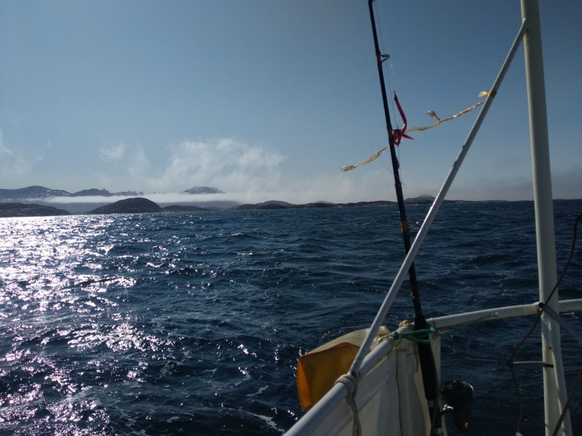 Eine Viertelstunde vor Ankunft hat Thomas noch kurz die Angel ins Wasser getaucht und zwei dicke Kabeljau gefangen. Kartoffeln mit Butter dazu, außerdem wird eine Flasche Rotwein geöffnet. Es gibt etwas zu feiern : Wir haben soeben den Polarkreis auf 66°34′ Nord überquert. Jetzt befinden wir uns tatsächlich in der Arktis. 🙂