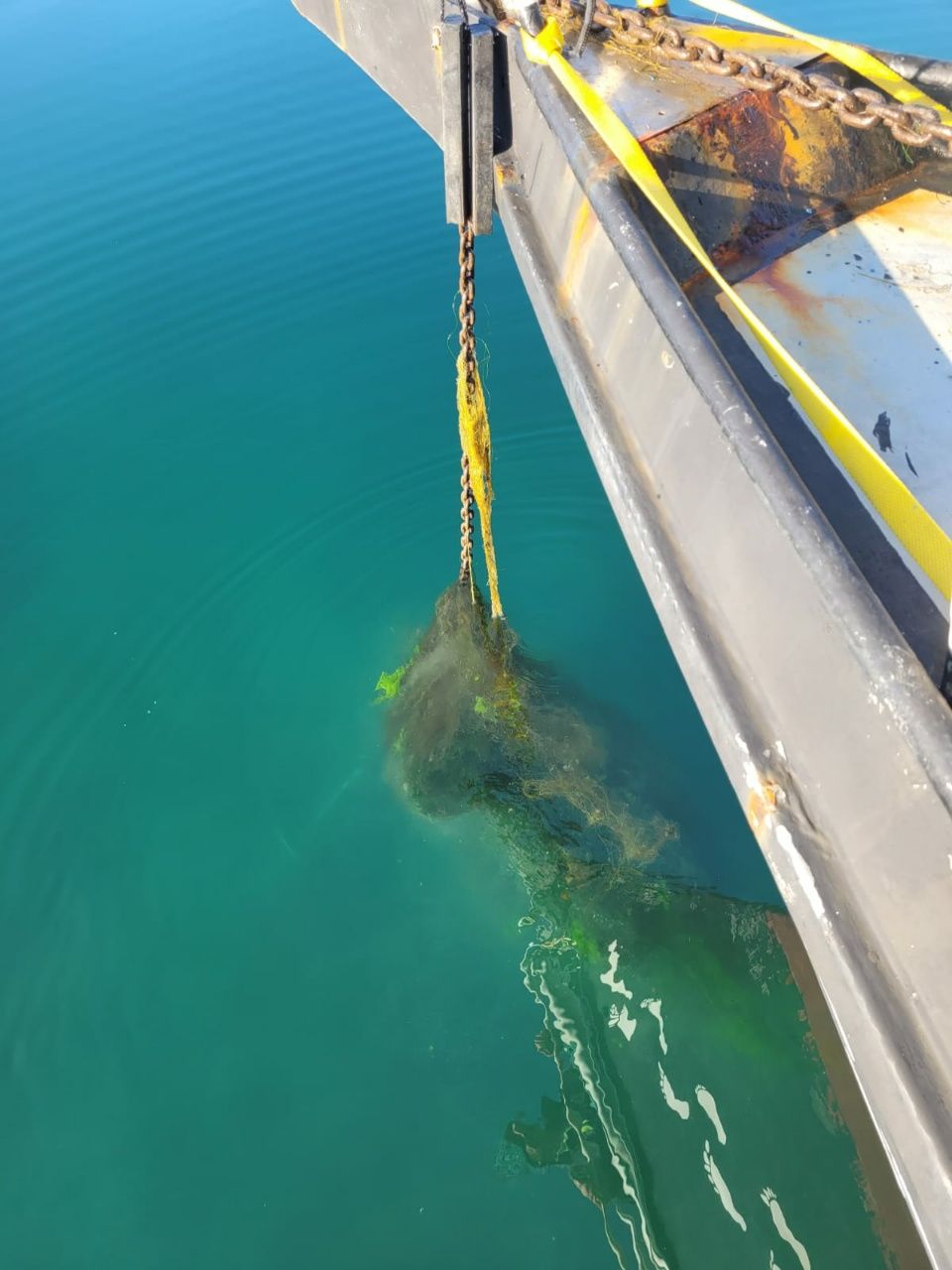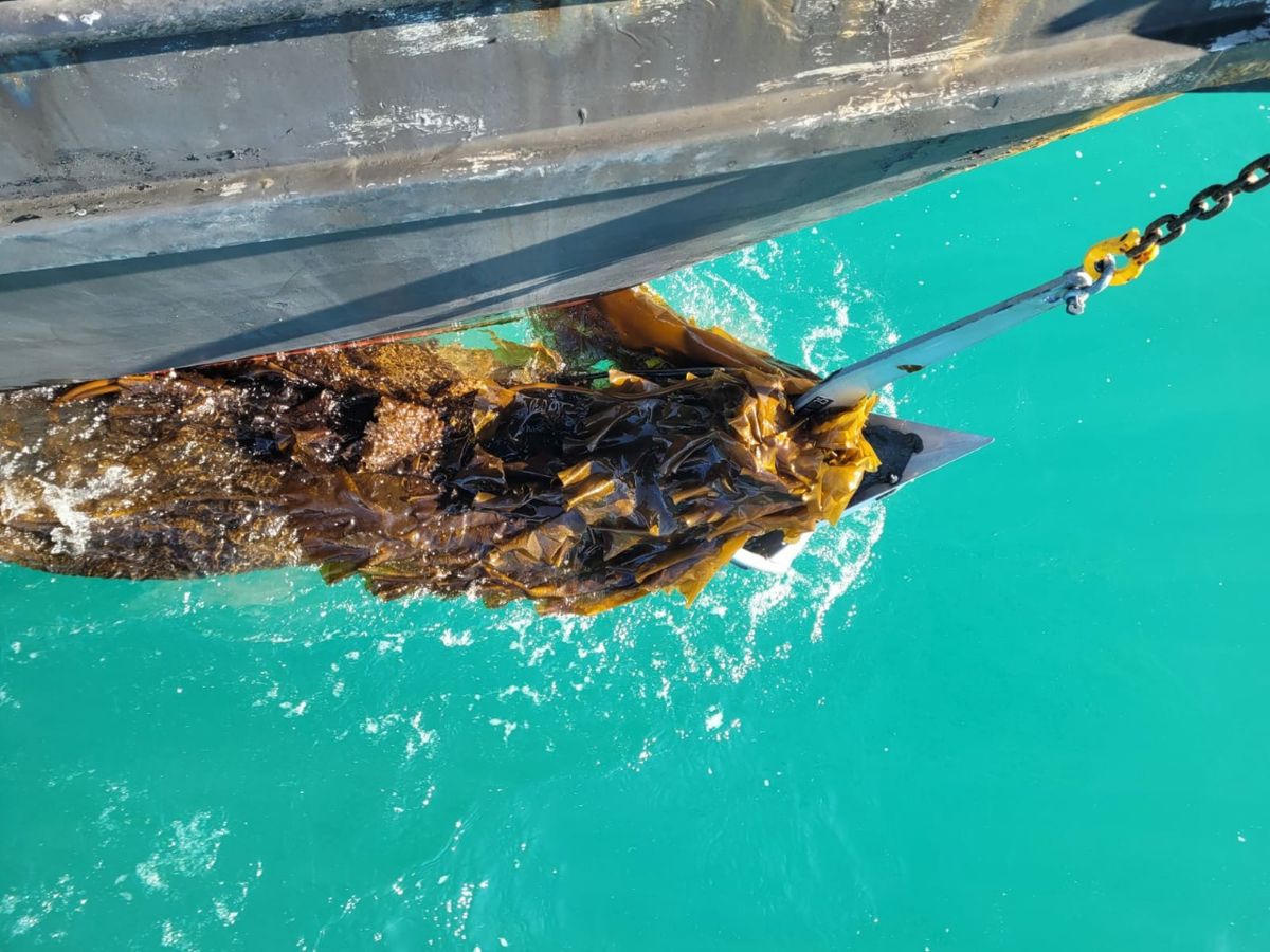 Der nächste Tag beginnt vielversprechend mit Sonnenschein. Allerdings spüren wir immer noch den Wind. Am Anker hängt wieder eine dicke Traube Kelp.