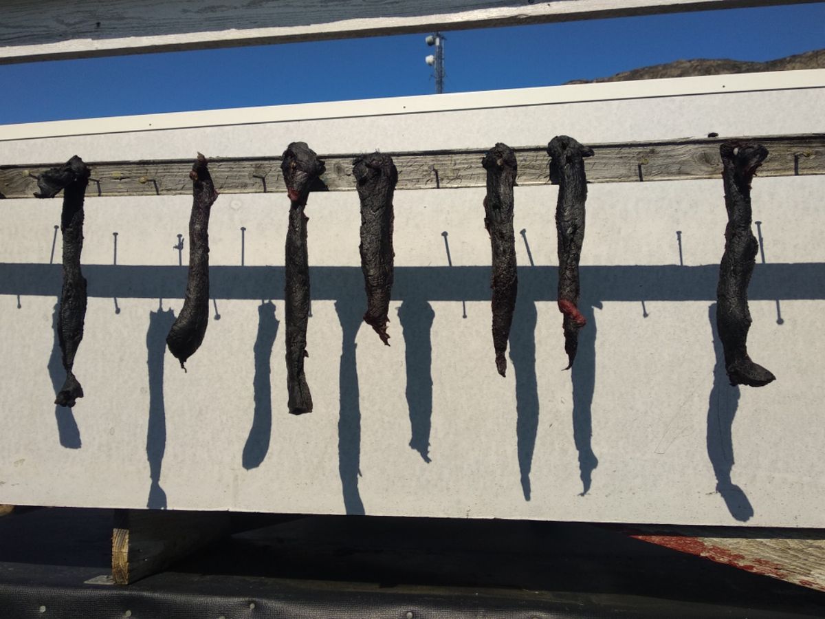Viele Häuschen auf den Hügeln sind nur so zu erreichen. Die Aussicht bei schönem Wetter ist beneidenswert. An einer Leine hängen Streifen von dunklen Fleisch zum Trocknen. Seerobbe, Rentier ( Karibu ) oder Walfisch ? Alles wird regelmäßig erlegt, gegessen und restlos verwertet. Die Jagd hat Tradition und ist ganz normal in Grönland. Nicht für den Export, sondern nur für den Eigenbedarf.