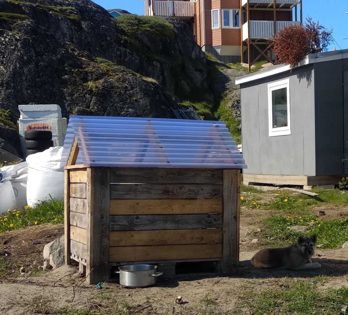 Wir finden eine Art Baumarkt, wo wir Leinen und Brenn-Spiritus kaufen. Außerdem sind wir auf der Suche nach einem Stück Ofenrohr. Dafür laufen wir noch ein Stück weiter raus bis zu einem riesigen Grundstück mit Werkstatt und Verkaufsraum. Im Geschäft haben die nicht, was wir brauchen, aber einer der Mitarbeiter geht mit Thomas draußen gucken. Da steht eine lange Reihe von Containern, und darin ist ein großer Teil der Waren untergebracht. Alles von außen ordentlich beschriftet, es hat System. Innen kein Platz, aber gewusst wie …. Wie praktisch. Zwei Container werden aufgeschlossen und durchsucht, aber alle Ofenrohre sind vom Durchmesser her nicht richtig. Daraufhin schickt der Mann uns um die Ecke und zeigt auf eine brachliegende Wiese. Wir sollen dort schauen, da wäre vielleicht etwas für uns. Gelangweilte Schlittenhunde teilen sich das Feld mit allerlei Gerümpel. Thomas erblickt sofort zwei Ofenrohre auf einem Haufen, der aussieht wie Sperrmüll. Passt – genau das, was wir gesucht haben. Schon wird das Portemonnaie gezückt, aber von Bezahlung wollen die netten Leute gar nichts wissen. Geschenkt. Qujanaq. 🙂 Der Kamin auf unserem Boot wird damit um mehr als einen Meter verlängert. Das erledigt mein allerbester Handwerker sofort. Und plötzlich macht der Ofen keine Mucken mehr, sondern brennt beim allerersten Anzünden und bleibt auch tatsächlich an. Wieder ein Erfolg.