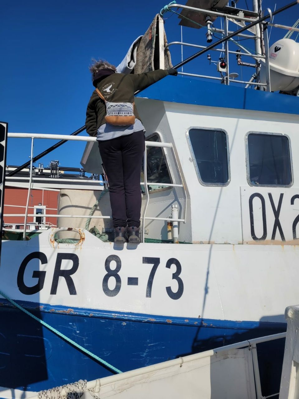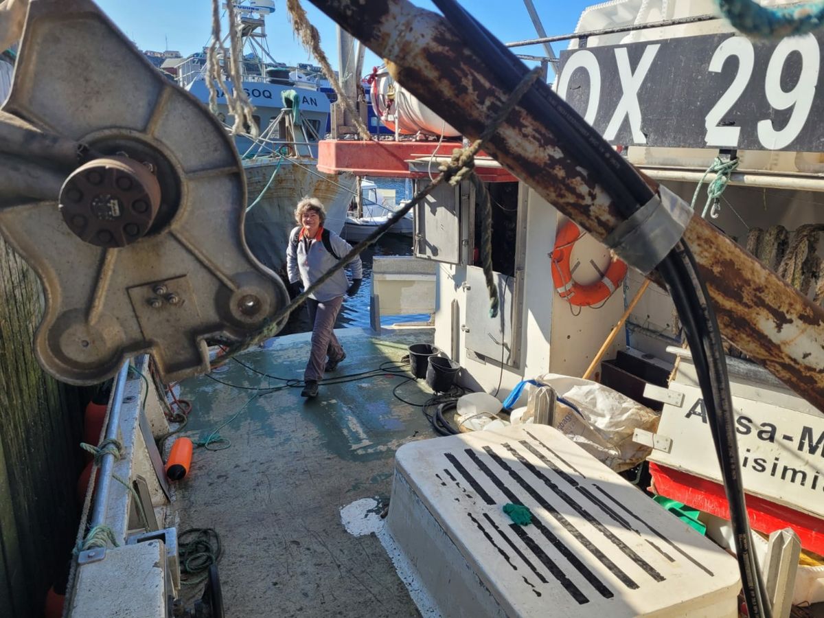 Gestern Abend mussten wir noch einmal ablegen, eine Runde im Hafen drehen und neu festmachen, weil die „Seabelle“ losgefahren ist. Früh am Morgen werden wir wach, weil etwas bei uns an Deck rumort. Springen ganz schnell in die Klamotten und stürzen nach oben, wo wir unseren Augen nicht trauen : Ein dickes Fischerboot schiebt sich gerade mit dem Bug zwischen uns und das Boot, an dem wir liegen. Die haben unsere vordere Leine gelöst, drücken die Walkabout zur Seite und drängen sich in die entstehende Lücke. Hinten steht ein junger Mann, um die Achterleine zu fieren, damit das Schiff dazwischen passt. Die sind ja witzig hier ! 😉 Haben sich nicht bemerkbar gemacht, noch nicht einmal geklopft, sondern binden uns ab und legen sich mitten hinein ins Päckchen. Reling schrappt an Reling, natürlich stimmt die Länge der Fender jetzt nicht mehr. Da darf man nicht zimperlich sein. Mit einem schicken und frisch gemalten Boot müsste man jetzt Angst haben. Wir klappen lediglich die äußere Solarpaneele etwas nach innen, ansonsten haben wir nicht viel zu befürchten. Uns ist die ganze Sache sehr sympathisch, weil die Grönländer nicht so viel Gewese machen, sondern einfach eine praktische Lösung finden. Lustiger Start in den Tag !