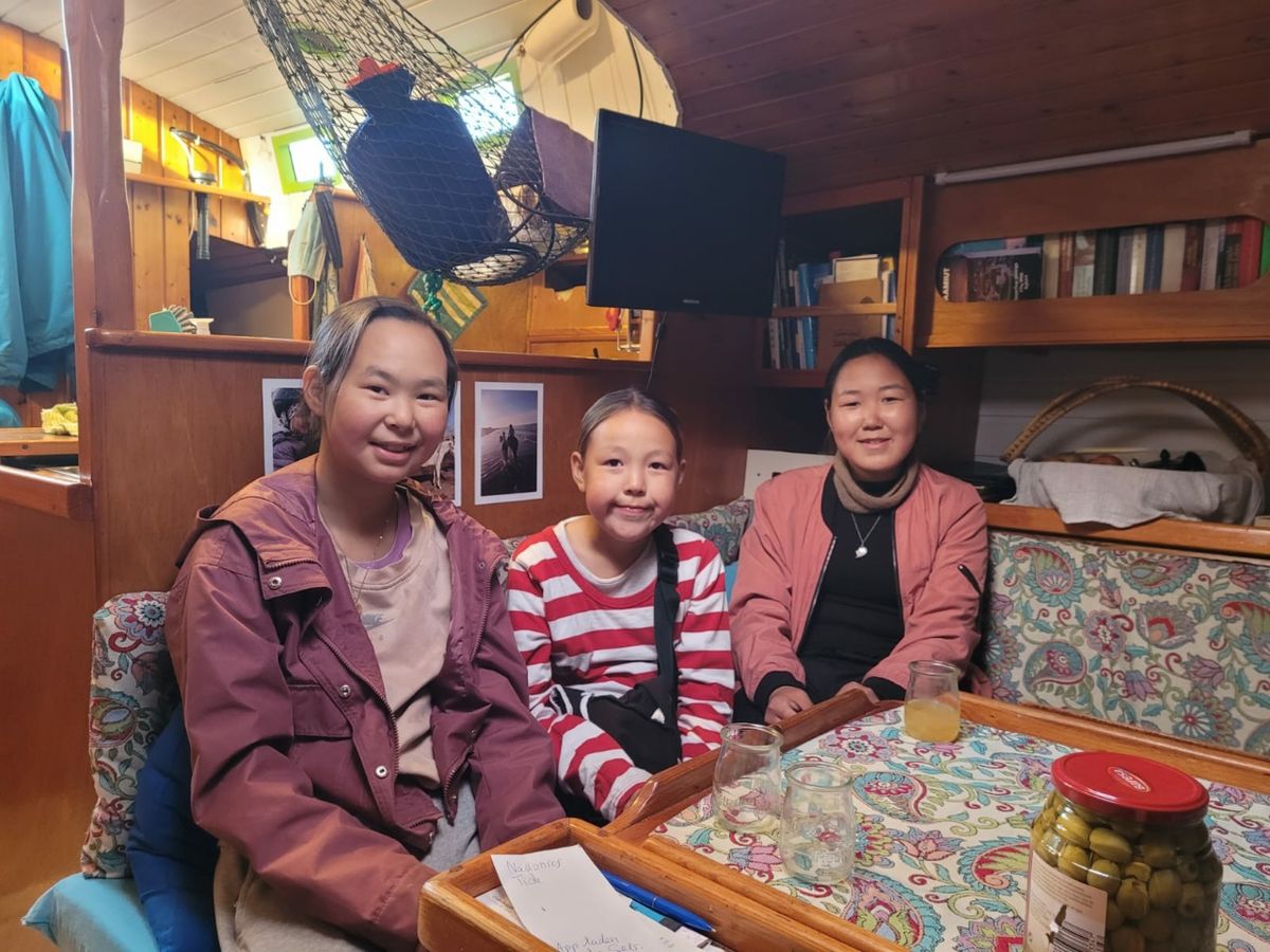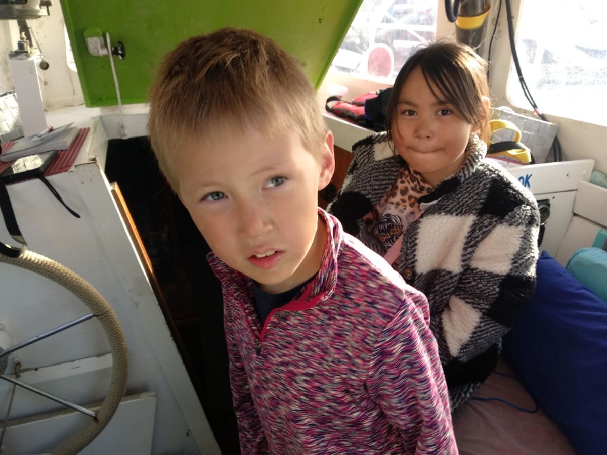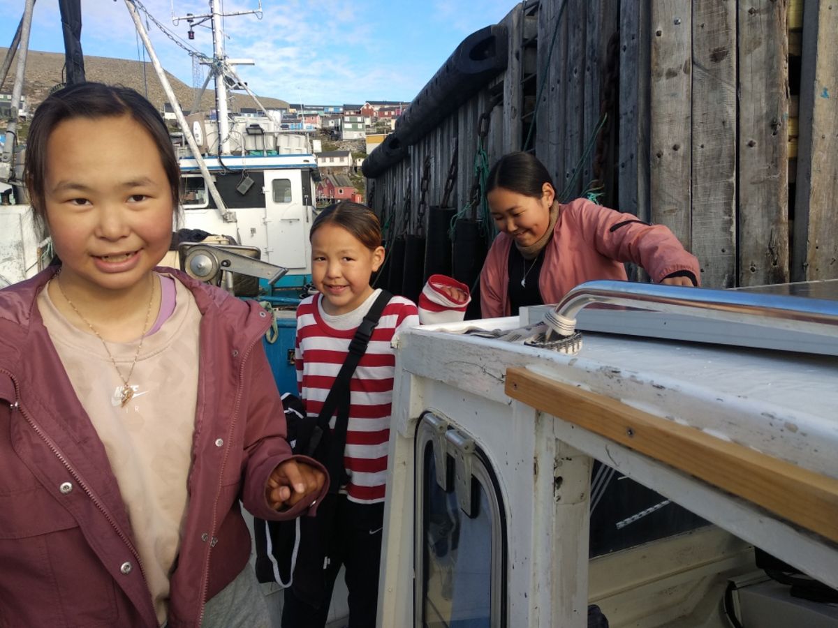Ankunft 18.00 Uhr in Upernavik, einem Ort mit 1100 Einwohnern. Hübsch am Hang gelegen, die bunten Häuschen leuchten in der Sonne. Eine Stunde vor Niedrigwasser haben wir beim Anlegen 2,40 Meter unter dem Kiel. Der Tidenhub liegt hier bei 2 Metern, die Walkabout braucht 1,70 Meter. Wir können den Grund sehen, offensichtlich sandiger Boden, keine Steine. Sollte passen. Gleich nach dem Festmachen bekommen wir Besuch. Oben an der Kaimauer steht eine Frau, die sehr interessiert ist und eindeutig zum Plaudern aufgelegt ist. Sie lädt uns für abends zum Tanzen im Dorf ein, aber ich glaube, das lassen wir lieber. 😉 Ein Junge und ein Mädchen möchten gerne zu uns an Bord. Die Spundwand ist zu hoch, deswegen holt Thomas eine Leiter aus der Backskiste, damit die Kinder herunterklettern können. Denen gefällt es offensichtlich auf der Walkabout. Nach einer ausgiebigen Boots-Besichtigung werden die Zwei richtig heimisch. Viola hat nicht ganz so viel Ausdauer und verschwindet nach einer halben Stunde. Ihr Bruder Alexander bleibt länger, er schaut in alle Ecken und will alles genau wissen. Ich bin erleichtert, als sein Telefon klingelt und er nach Hause zitiert wird. Es dauert aber gar nicht lange, da ruft es erneut von oben. Viola und Alexander stehen bereit für die nächste Runde auf dem Abenteuer-Spielplatz. Ein Apfel, ein Glas Saft, ein Bonbon später….. Was ist dies ? Was ist das ? Die bekommen einfach nicht genug.