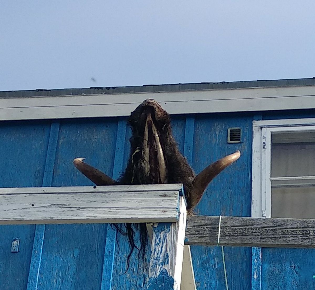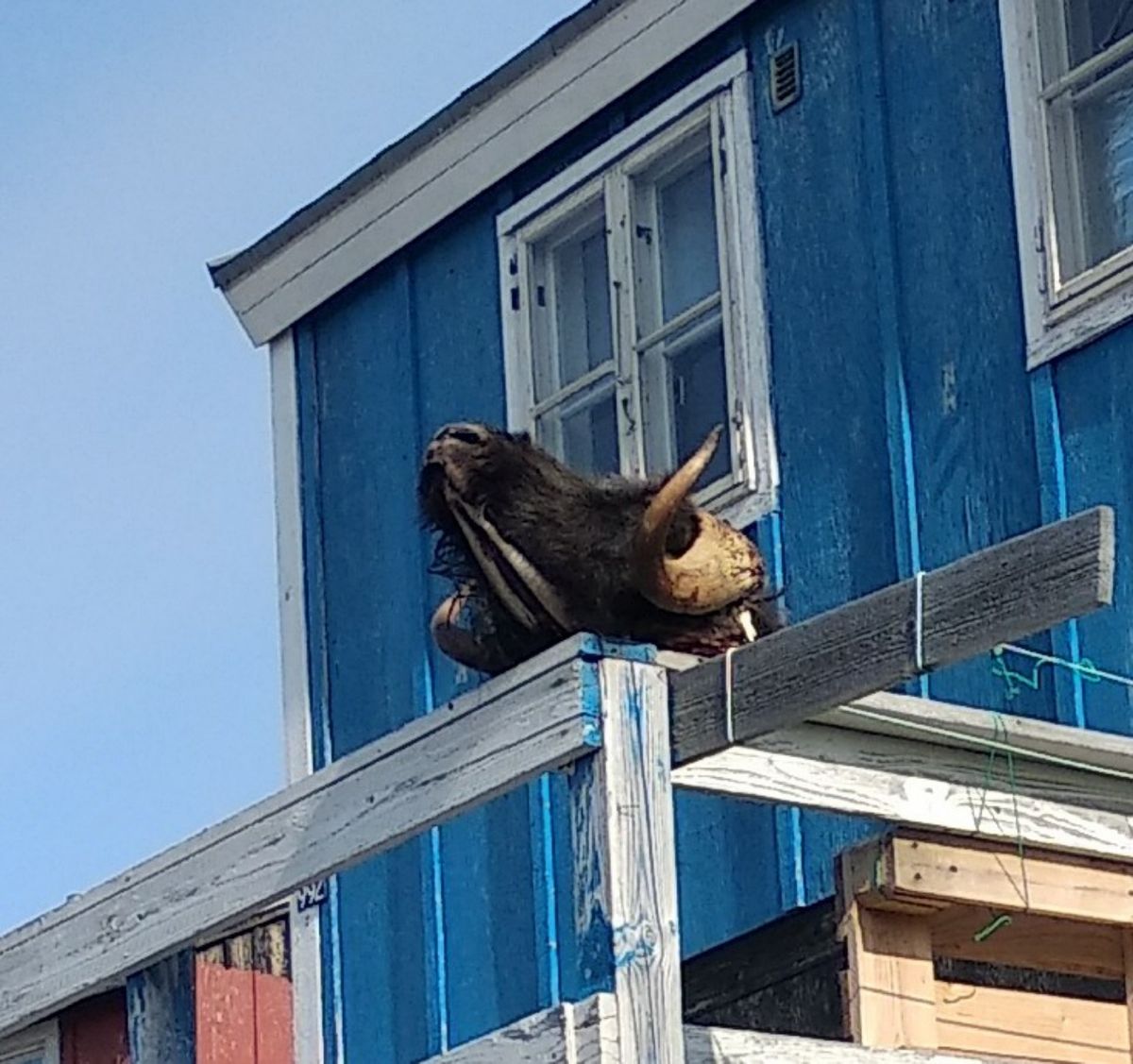 Morgens früh beim Kaffee hören wir eine bekannte Stimme rufen. Alexander ist wieder da. Diesmal mit mit seiner Mutter, die auch gerne unser Boot besichtigen würde. Wir möchten gerne den Ort erkunden und haben einige Dinge zu erledigen. Unser Dorf-Rundgang findet zu Viert statt. Am Geländer eines Balkons hängt der Kopf eines Moschusochsen, noch mit ordentlich Fleisch und Fell dran. Sehr befremdlich, ich find’s eklig. Wie kommt man bloß dazu, sich so ein stinkendes Ding vor die Tür zu hängen ? Anscheinend ist das eine Trophäe, die den Nachbarn zeigen soll, was für ein guter Jäger im Haus wohnt.