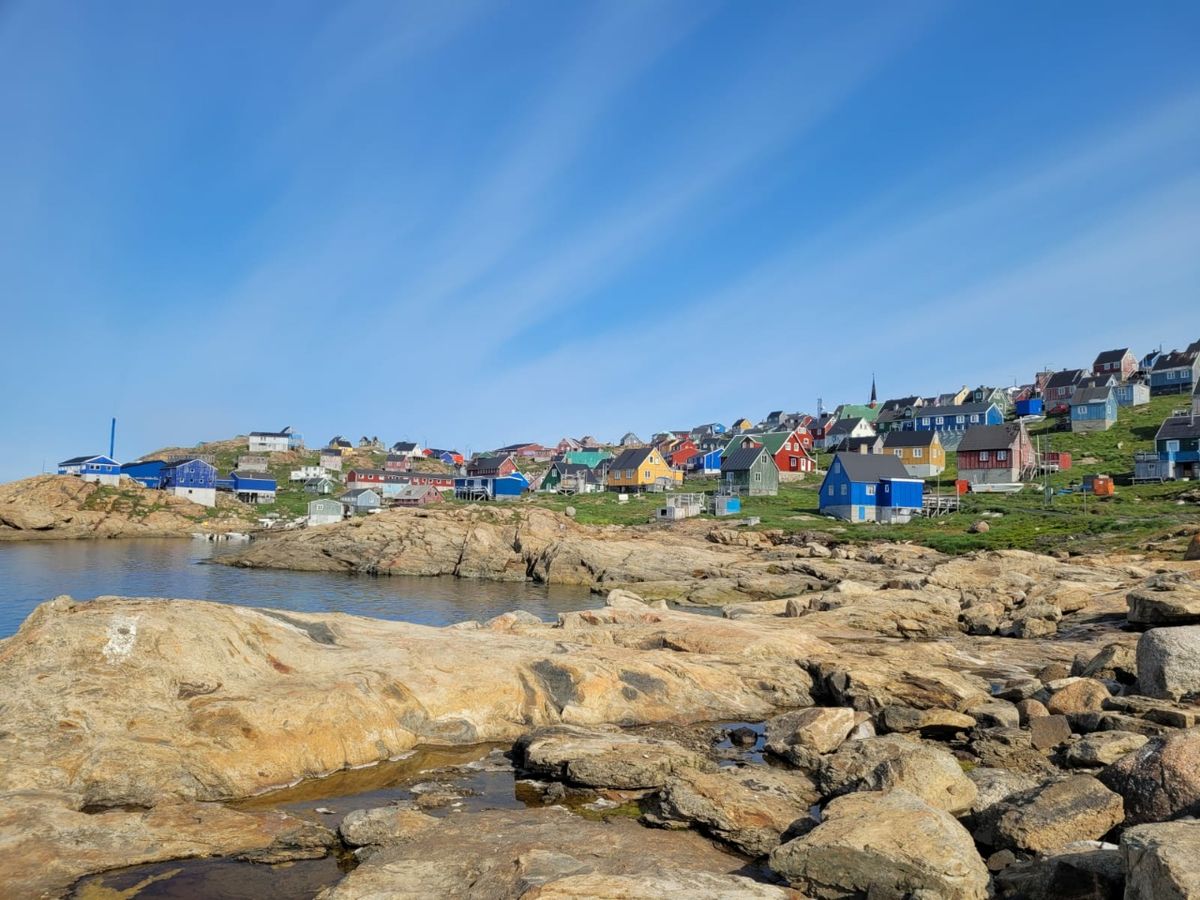 Der Ort Aasiaat hat 3000 Einwohner, ist also ziemlich überschaubar. Hier sehen wir die ersten Glas-Container und Sammelbehälter für Verpackungen, Kunststoff, Dosen. Das ist ja richtig fortschrittlich. Hoffentlich gibt es bald mehr davon. Leider ist Grönland in Sachen Müll-Sortieren sehr hinter dem Mond. Wir suchen die Polizei-Station zum Abmelden. Die ist nur wenige Stunden am Tag geöffnet, und die Zeit passt gerade. Eigentlich muss das hier noch gar nicht sein, aber wenn wir ausgecheckt haben, dann sind wir freier in unseren Entscheidungen. Eine Sekretärin und eine Polizistin besetzen die Wache. Die Dame in Uniform ist deutscher Abstammung, in Grönland geboren und mit einem Schweizer verheiratet. Was für eine interessante Mischung – auf jeden Fall die erste Person in Grönland, die mit uns deutsch redet. Und freundlich sind sie, wie alle Menschen, mit denen wir in Kontakt kommen.