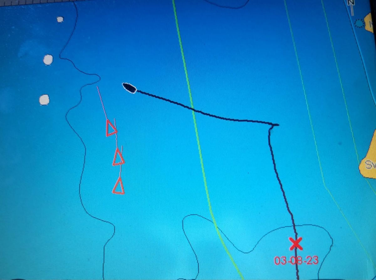 Auf einmal wird es spannend. Auf dem Plotter geht der AIS-Alarm los. Der Bildschirm zeigt einen Konvoi von Frachtschiffen, drei rote Pfeile in Reihe, die inzwischen als „gefährliches Schiff“ eingestuft werden. Kollisionskurs. Jedes hat 230 Meter Länge, aber der Nebel ist so dicht, dass ich keins sehen kann. Die gehören eindeutig zusammen, selbst die Namen ähneln sich. Fahren dicht hintereinander und kommunizieren bei jeder Änderung von Kurs oder Geschwindigkeit über Funk miteinander. Ich hoffe mal, dass die aufmerksam sind und uns sehen. Dann kann man eigentlich davon ausgehen, dass die Frachter ihren Kurs geringfügig ändern, damit wir gut aneinander vorbei kommen. Ist ja für die nur ein Schnipp mit dem kleinen Finger, während ich unter Segeln gerade nicht so einfach ausweichen kann. Aber nichts passiert, die fahren ihren Kurs einfach weiter. Begegnung in einer Stunde in weniger als einer Viertel Seemeile Entfernung – das ist mir entschieden zu wenig. Wir fahren eine Wende.