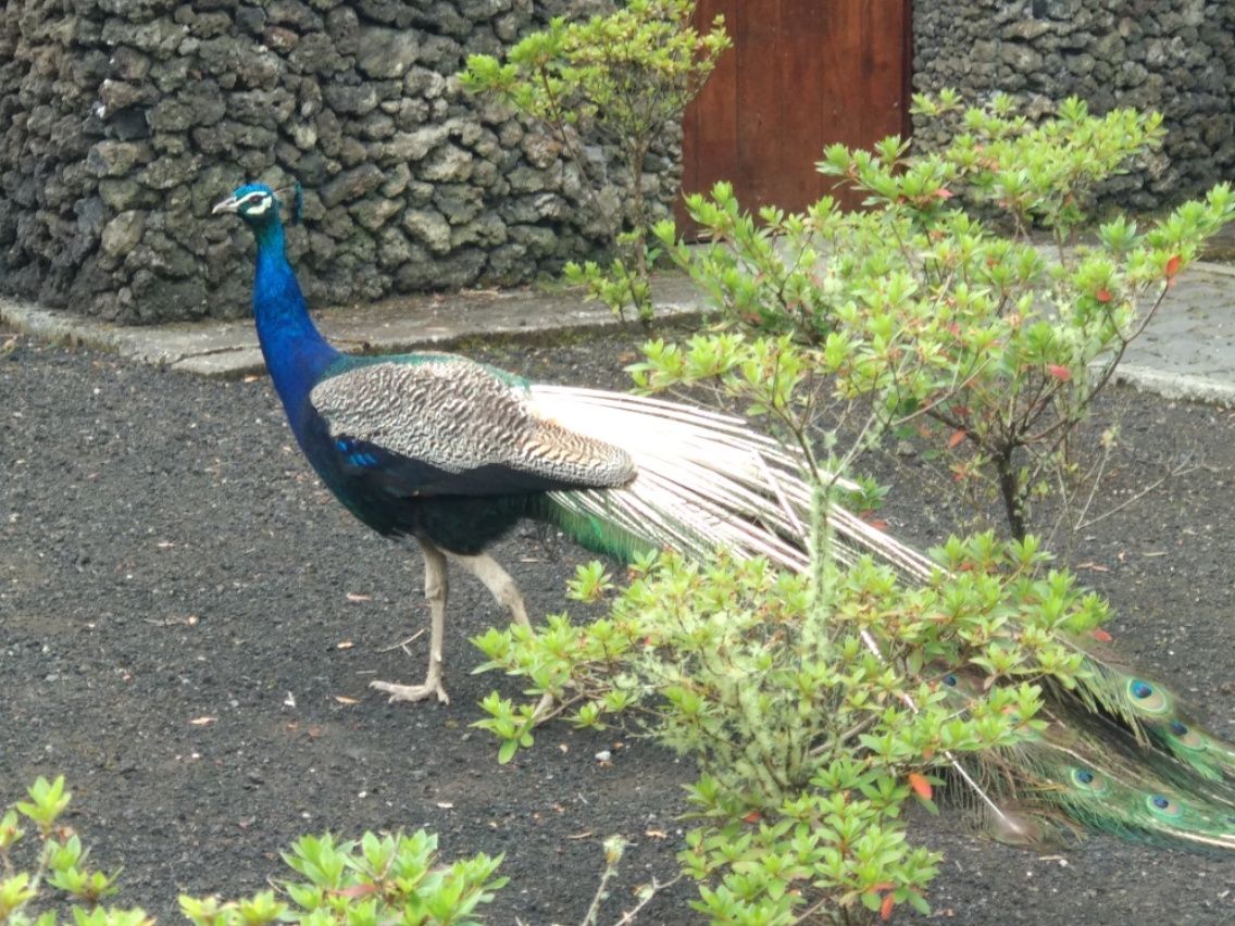 Abendessen am Picknick-Tisch im Parque Florestal. Das ist ein sehr schön angelegter Park mit Grillplätzen, Tischen, Bänken, Sanitäranlagen, Spielplatz, Behältern zum Trennen von Müll. Wir fragen uns nur : „Für wen ?“ Auf jeden Fall ist nichts los, wir sind die einzigen Besucher. Dutzende von Singvögeln leisten uns Gesellschaft. Zum Teil picken sie am Boden um uns herum, die ganz Mutigen wagen sich sogar auf den Tisch. Die Vogel-Vielfalt der Azoren steht in starkem Kontrast zu den Kanarischen Inseln. Überall zwitschert und tiriliert es. Und dann trauen wir unseren Augen nicht, denn es läuft plötzlich ein Pfau durch die Landschaft. Ein Männchen mit buntem Federkleid, dem mit etwas Abstand ein unscheinbares Weibchen folgt. Die scheinen hier im Park zu wohnen.