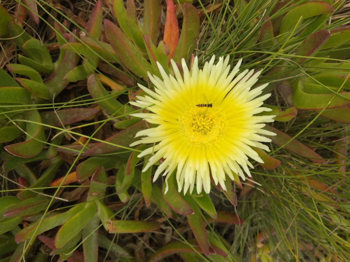Wir klettern über moosbewachsene Mauern, über Treppen mit Stufen aus Bruchstein, Balancieren auf Waschbeton-Platten über die Wasserrinne. Ein paar Ziegen stehen am Wegesrand. Sehr schöne Landschaft auf den offenen Strecken, wo Hortensienhecken als Begrenzung zwischen den Feldern wachsen. Kommen an zwei kleinen Höhlen vorbei, die bei schlechtem Wetter ausreichend Schutz bieten. Dann stehen wir vor einem Tunnel und müssen die Lampen herauskramen. Sehr abwechslungsreich, das ist ein richtig toller Weg entlang der Levada. 🙂