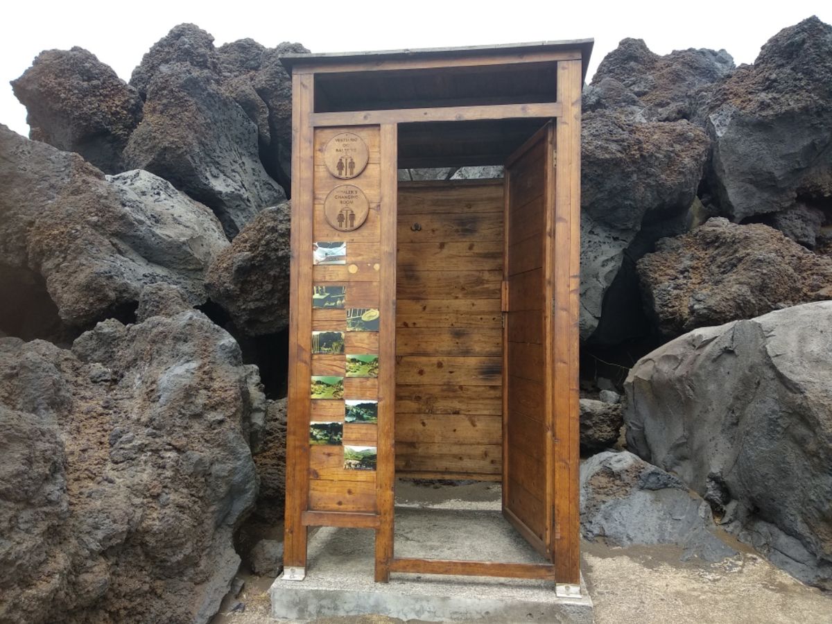 Himmel bedeckt, Niesel, schwarze Wolkenwand im Westen, dahinter ist ein heller Streifen am Horizont zu sehen. Azoren-Wetter. Das muss man nehmen, wie es kommt. Der Wetterbericht für die nächsten 7 Tage zeigt durchweg Sonne mit einer kleinen Wolke davor, 0 % Regen-Wahrscheinlichkeit. Wir gehen nach dem Frühstück los, bzw. nehmen den Bus bis Capelo im Westen. An der Kirche startet unsere Runde, die zunächst abwärts bis zur Küste verläuft. Betörender Anis-Duft liegt in der Luft und erinnert an Lakritz-Stand auf dem Jahrmarkt. Wild wachsender Fenchel steht in voller Blüte. Wir kommen an einem kleinen weißen Leuchtturm vorbei. Kurz darauf erreichen wir die Natur-Schwimmbecken von Comprido, wo allerdings ziemlich viel los ist. Besondere Aufmerksamkeit verdient eine hölzerne Umkleidekabine zwischen den Felsen.