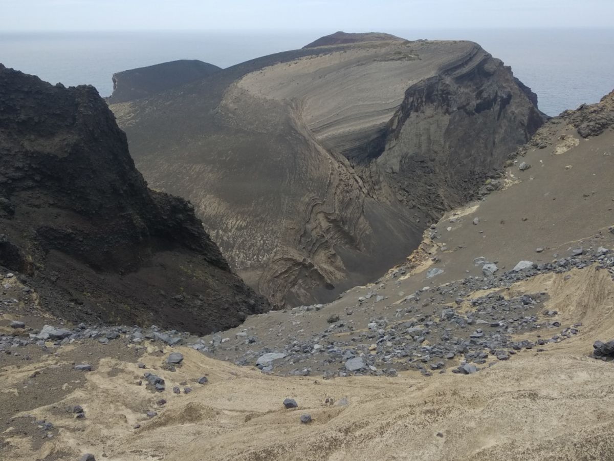 Nach etwa 4 Stunden erreichen wir eine Kreuzung, an der wir wieder auf die Route der 10 Vulkane einsteigen. 1000 Meter Aufstieg sind nahrhaft. Trotzdem kommen wir früher als geplant oben an und möchten noch die Krater-Umrundung wagen. Höchste Erhebung ist der „Cabeco Gordo“ mit 1043 Metern. Wir wandern im Uhrzeigersinn auf einem schmalen Grat um die Caldeira. Es passen gerade mal zwei Füße nebeneinander. Das Wetter ist nicht strahlend schön, aber gut genug, um das Innere des gesamten Kraters genau zu erkennen. Der Vulkankegel hat 1,5 – 2 Km Durchmesser.