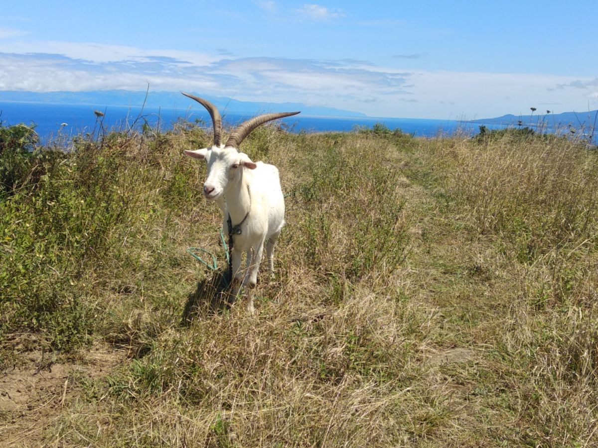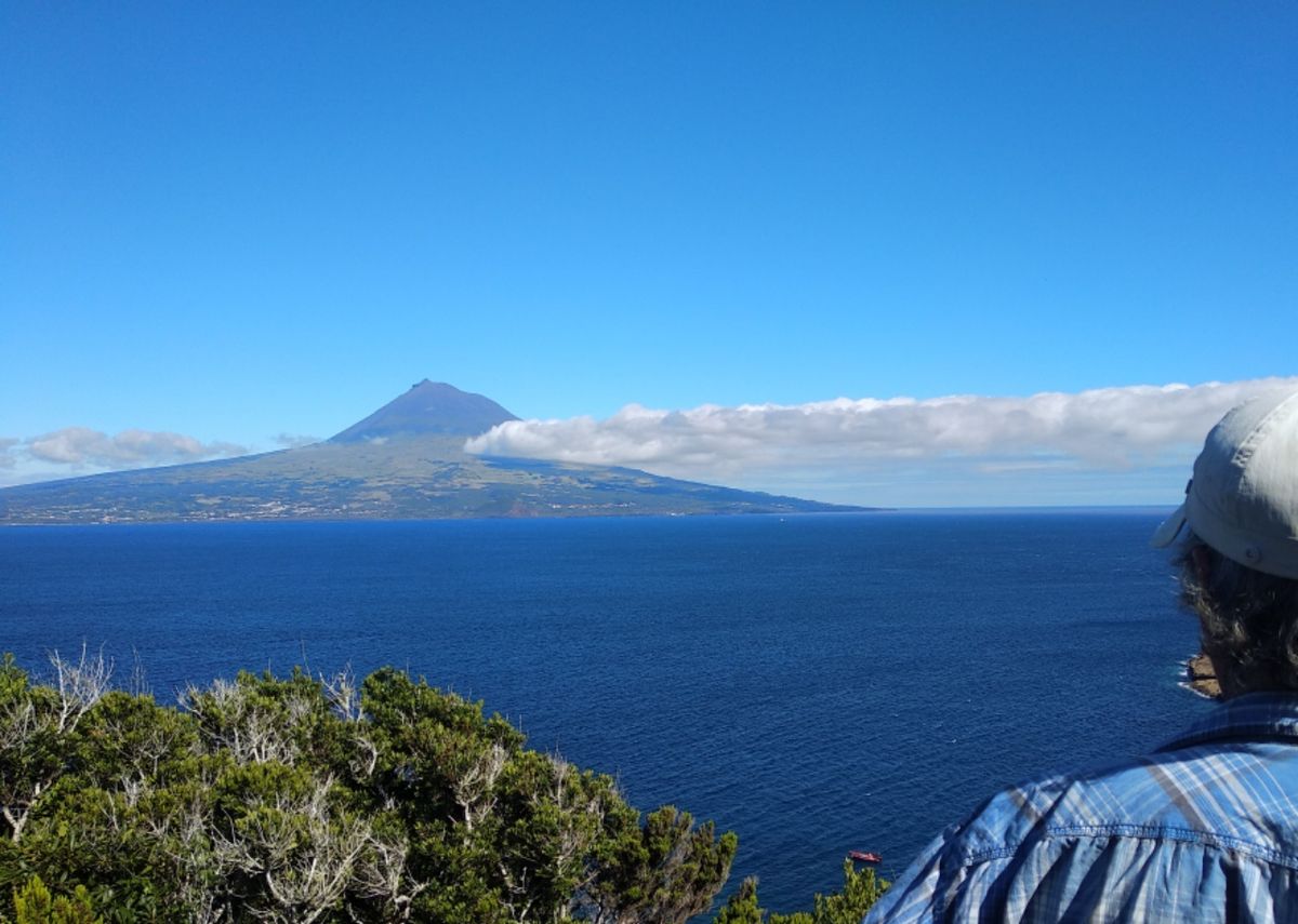 Ein Ziegenbock versperrt den Weg und weigert sich hartnäckig, uns vorbei zu lassen. Wir klettern über einen Zaun und steigen zwischen Bäumen auf engem Pfad immer weiter hinunter, bis wir eine Badestelle erreichen. Was für ein toller Ort für eine Pause ! Wir sind total begeistert. Kostenloser Zeltplatz, Grillstellen, Tische und Bänke, Badeleitern, Dusche, Toiletten und Mülleimer. Ein kurzer Blick auf die Uhr, um die Zeit abzuschätzen. Das passt, wir gönnen uns ein erfrischendes Bad im Atlantik. Das Wasser ist herrlich klar, es ist sauber und riecht nicht nach Fisch. Es tut gut, sich den Schweiß abzuspülen und andere Muskeln zu bewegen. Anschließend gibt es eine Süßwasser-Dusche und weiter geht’s auf die letzten Kilometer. Leider viel zu kurz führt der Weg an einer beeindruckenden Steilküste entlang. Wieder bieten sich fantastische Ausblicke auf die Inseln Graciosa, São Jorge und Pico, denn das Wetter ist inzwischen total schön geworden. Aufpassen, nicht zu nahe an den Rand treten, denn hier geht es senkrecht hinunter. Auf der anderen Seite steht mehrere Meter hohes Schilfrohr. Dann folgen wir einem verschlungenen Pfad über Wiesen und Weiden bis in den Ort Ribeirinha, wo wir in den Bus nach Horta steigen.