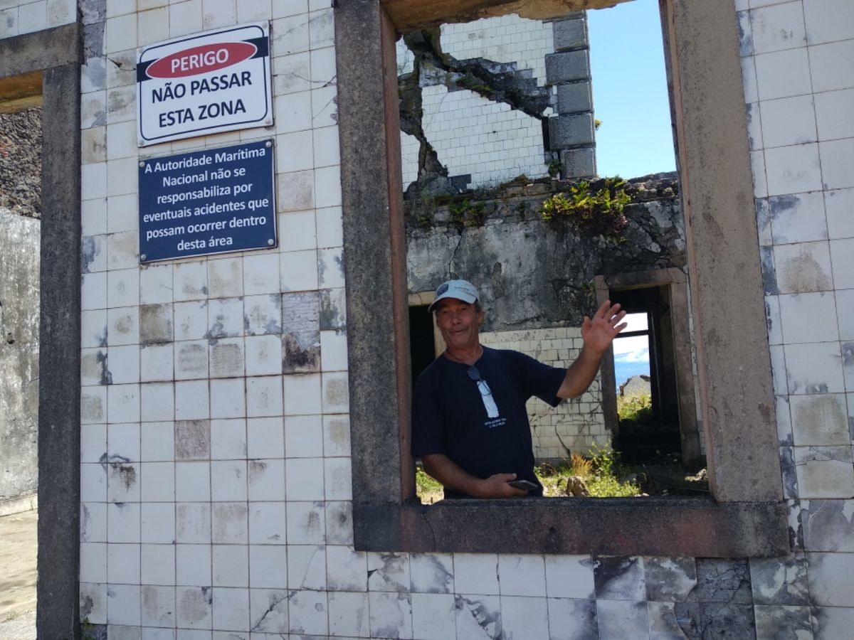 Pause im Bus-Wartehäuschen. Hier stellen wir fest, dass wir nicht mehr auf der richtigen Route sind, einmal falsch abgebogen und zu weit nach Norden gelaufen. Den Fehler haben wir zum Glück recht früh bemerkt, es kostet nur einige Extra-Kilometer. Am Miradouro da Ribeirinha haben wir eine sehr schöne Aussicht auf das Dorf unter uns. Kleine weiße Häuser inmitten grüner Landschaft, dahinter das Meer. Von jetzt an wird unsere Route sehr abwechslungsreich. Wir machen einen Abstecher zum alten Leuchtturm, der 1998 durch ein Erdbeben zerstört wurde. Die Ruine sieht aus, als ob ein Windstoß genügen würde, um die Reste des Turmes einstürzen zu lassen.