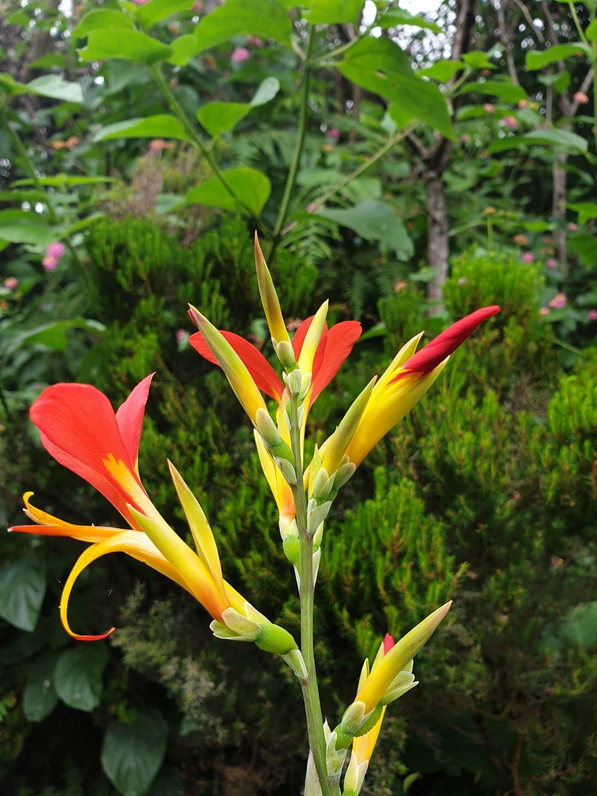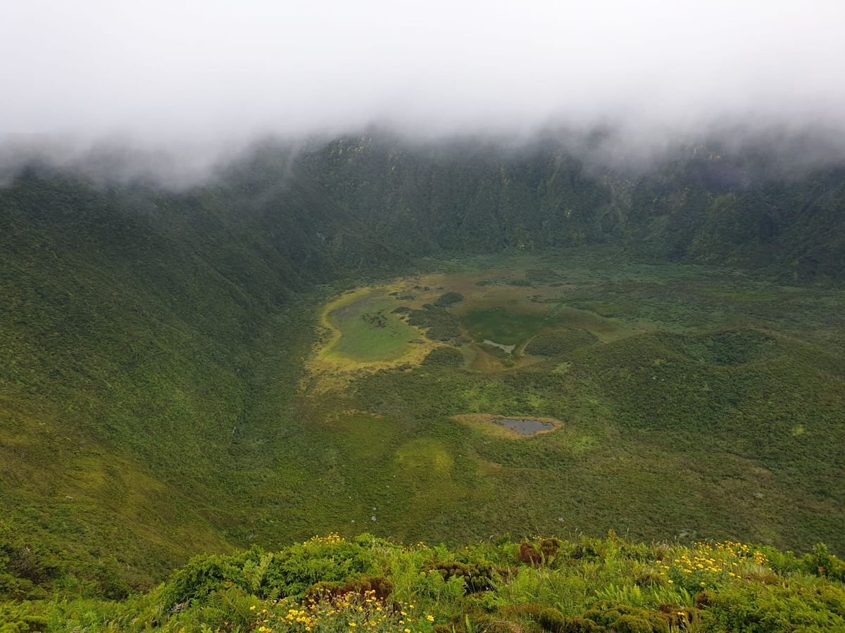 Wir folgen einer Schotter-Piste immer höher hinauf und kommen zu einem Betonhäuschen auf einem Hügel, ähnlich einer Schießscharte. Das ist die Vigia de Baleia. Von hier aus wurde früher das Meer beobachtet und Wal-Sichtungen gemeldet. Es riecht würzig nach Wacholder. Über unzählige mit Holzbohlen befestigte Stufen geht es steil nach oben. Ein kurzer Seitenweg führt zu einer Höhle, in die wir ein kleines Stück mit unseren Kopflampen eindringen. Nicht besonders spannend, lohnt sich nicht. Während des weiteren Aufstiegs folgen wir nur noch einer schmalen Spur durch Geröll. Ein zu beiden Seiten zugewachsener Grat führt um den Krater des zweiten Vulkans herum, den „Cabeco do Canto“. Anstieg, einmal auf schmalem Grat um den Kraterrand herum, Abstieg und Gegenanstieg zum nächsten Gipfel. Null Aussicht, dichte Nebelschwaden am Himmel. Aber dafür erleben wir eine leuchtende Blütenpracht im grünen Dschungel. Hier wachsen Pflanzen, die wir noch nie zuvor gesehen haben.