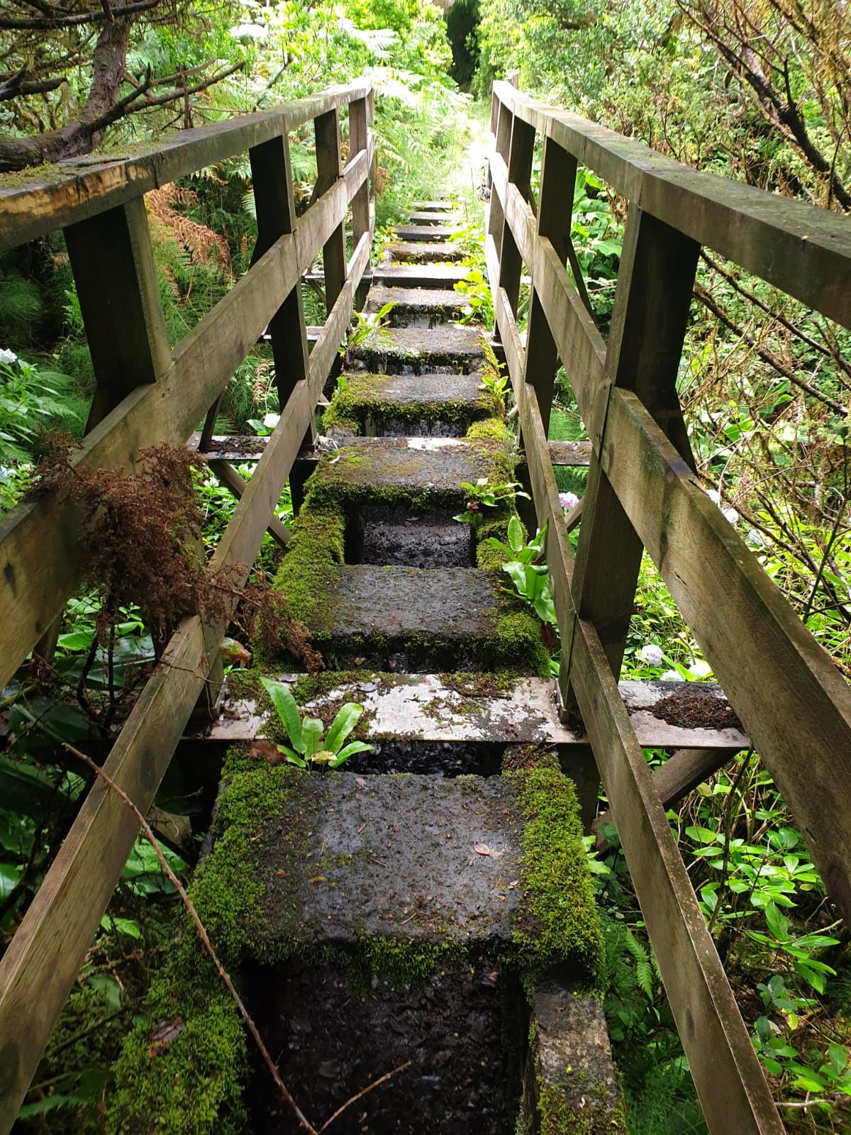 Dominiert wird Faial vom großen Krater der Caldeira, dessen gesamtes Gebiet unter Naturschutz steht. Der Kachelmann-Wetterbericht sagt für morgen einige Sonnenstunden und wenig Niederschlag voraus. Wir nutzen die zweite Chance auf einen klaren Tag im Reserva Natural da Caldeira. Mit dem Bus fahren wir bis nach Cascalho de Cima. Schon wieder sind wir die einzigen Fahrgäste. Zunächst folgen wir einer asphaltierten Straße nach oben. Grauer Himmel und Nieselregen. Sehr ländlich ist es hier. Allerdings scheinen viele der Höfe verlassen zu sein, stehen zum Verkauf oder sind einfach dem Verfall preisgegeben. Ein Bauer kommt uns entgegen. Er führt eine stattliche Kuh am Strick hinter sich her wie einen Hund an der Leine. Wir müssen uns dünn machen und an den Rand drängen, weil eine ganze Herde Kühe folgt. Den Abschluss bildet ein Geländewagen, der die Herde nach hinten absperrt. An einem Wasserspeicher machen wir Pause und schauen den Vögeln beim Bad in den Pfützen zu. Unser Weg wird immer schmaler, überhängendes Grünzeug von beiden Seiten. Rechts und links stehen die Hortensien 5-6 Meter hoch. Plötzlich ist die Straße zu Ende, ein Wanderweg führt in dichten Urwald. Sehr wild, umgestürzte Bäume modern vor sich hin und werden von Unkraut überwuchert. Die Luft-Feuchtigkeit ist enorm, der Schweiß rinnt in Strömen. Zwei Stunden folgen wir einer matschigen Spur entlang einer alten Wasserrinne ( Levada ). Wackelige Holzbrücken dienen zum Überqueren der tiefsten und nassesten Passagen.