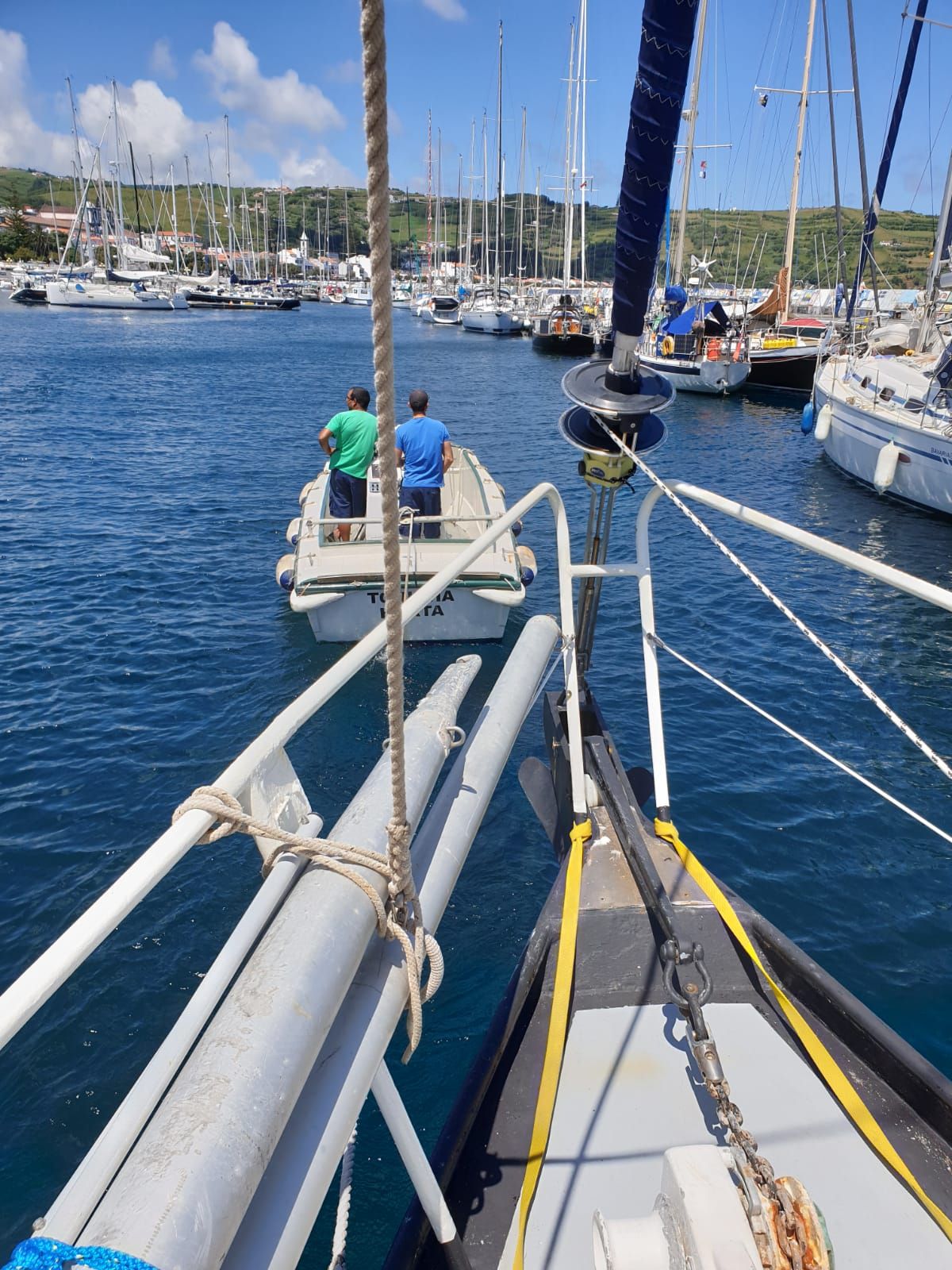 Am 29.07. haben wir eine Versandanzeige von SVB in den e-mails. Lieferstatus : zugestellt. Aber unser Paket ist nicht da. 🙁 Hin und her am Telefon, Lieferanzeige noch einmal überprüft, am 28.07. sollte es in Lissabon an den Zusteller übergeben worden sein. Aber wo haben die das bloß hingeschickt ? Wir warten auf Antwort und kommen erst einmal nicht weiter. Dafür werden wir Freitag früh durch laute „Hello“-Rufe geweckt. Ein Marinero teilt uns mit, dass wir den Platz räumen müssen, weil dieser wegen der Regatta am Wochenende gebraucht wird. Wir sollen verholen, entweder vor Anker gehen oder wieder im engen Päckchen an der Kaimauer festmachen. Montag wird die Box wahrscheinlich frei werden, und wir dürfen dann zurück an den Steg. Thomas erzählt ihm, dass wir die Maschine nicht benutzen können, solange unser Ersatzteil nicht da ist. Bei mir regt sich der Trotzkopf. Bin sauer über die Störung ( naja, immerhin ist es schon 9.00 Uhr 😉 ). Warum sollen wir unseren Liegeplatz hergeben ? Und warum haben die uns im Office beim Anmelden nicht gleich gesagt, dass wir nur befristet bleiben können ? Immerhin nimmt uns das die Möglichkeit, unser Boot hier alleine zu lassen. Eigentlich wollten wir in den nächsten Tagen mit der Fähre rüber zur Nachbarinsel Pico und dort mit Zelt ein paar Tage wandern. Die Überfahrt nach Magdalena dauert 30 Minuten und kostet nur 4,- € pro Person. Klingt nach einem guten Plan, geht jetzt aber nicht. Weder am Anker noch in der 3. oder 4. Reihe können wir die Walkabout verlassen. Ich bin genervt, Thomas bleibt gelassen. Da wir nicht mit Motor rangieren können, brauchen wir Hilfe. Am Nachmittag kommen zwei Marineros mit einem stark motorisierten Schlauchboot und schleppen uns an den neuen Platz. Es ist jetzt schon der 5. seit unserer Ankunft. Immerhin haben wir nette Nachbarn, eine Männer-Crew aus Schottland. Dann ist da noch die „High Cotton“ aus den USA, ein größeres Segelboot der Marke „schick und teuer“. Auch da müssen wir übersteigen, um an Land zu kommen. Die Walkabout liegt ganz außen im Päckchen, bisher noch kein anders Boot vor und hinter uns. Das bedeutet, es kann Niemand in den Salon gucken. Sehr gut. 🙂