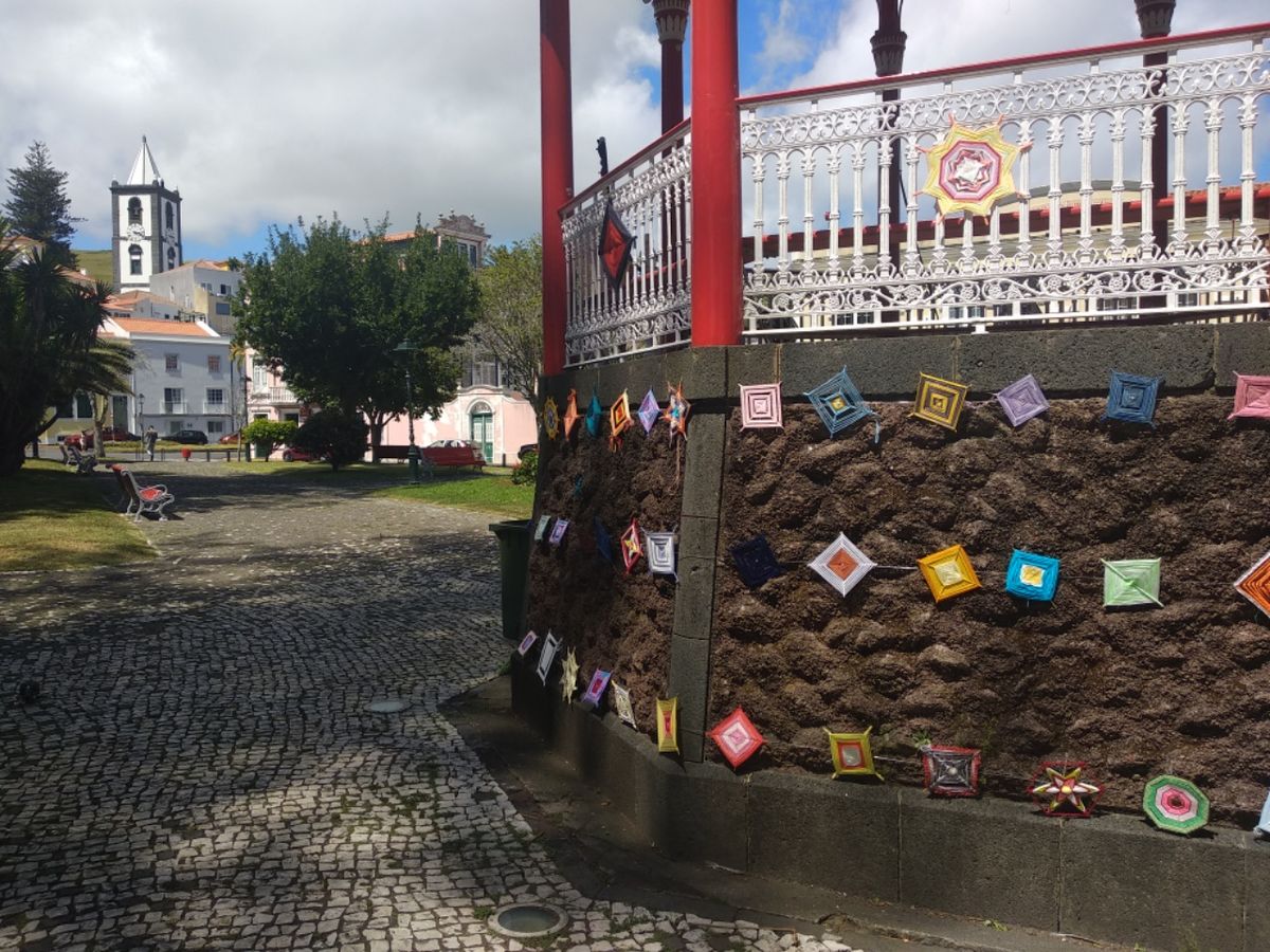 Am nächsten Tag steigen wir noch einmal auf unseren „Hausberg“ Monte Queimado und auf der anderen Seite wieder hinunter zum Strand von Porto Pim. Die letzten Wasserproben scheinen in Ordnung gewesen zu sein, auf jeden Fall ist das Baden heute erlaubt. Von dort erweitern wir unsere Runde, indem wir entlang der Klippen zur Halbinsel balancieren. Aufstieg zum Monte da Guia, vorbei am Aussichtspunkt des Neptuns und an der kleinen Kapelle. Diesmal gehen wir den Weg anders herum, weil wir nicht immer das Gleiche machen möchten. 😉 Tatsächlich ist die Insel Faial ziemlich ausgereizt. Für den letzten Abschnitt wählen wir die Küstenstraße. Dort entdecken wir etwas Neues, nämlich alte Militär-Wachtürme, deren Umrisse wir bereits vom Hafen aus gesehen haben und nicht deuten konnten. Die Türme sehen wirklich nicht vertrauenerweckend aus, die Leitern wurden vorsorglich entfernt. Einsturzgefahr. Eigentlich ist diese Ecke abgesperrt, aber wir sind natürlich neugierig, und der wackelige Zaun ist leicht zu umgehen. Vor den stählernen Plattformen sind Treppenstufen halbkreisförmig angeordnet. Das Ganze erinnert an ein Amphitheater. Kurz dahinter kommt ein weiterer Aussichtspunkt, wo wir entlang des Zauns wieder auf die Straße klettern.
