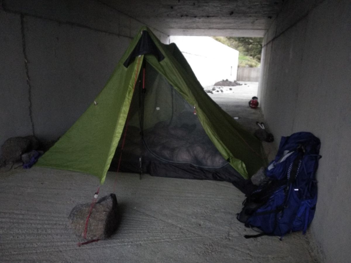 Fürchterliche Nacht. 🙁 Der Wind wird zum Sturm, der durch unseren Tunnel noch kanalisiert wird. Die Böen pfeifen um uns herum, die Zeltwände schlagen laut, bis die Seite bei Thomas ganz einstürzt. Nebel und Sprühregen dringen ein. Auf dem Betonboden der Unterführung bilden sich Rinnsale, die schnell breiter werden und auch unter unserem Zelt fließen. Nach einer Stunde bilden sich Pfützen innen, die Isomatten liegen auf nassem Grund, mein Schlafsack hängt an der Seite im Wasser. Das hatten wir doch letztens schon mal. So macht Zelten keinen Spaß. 🙁