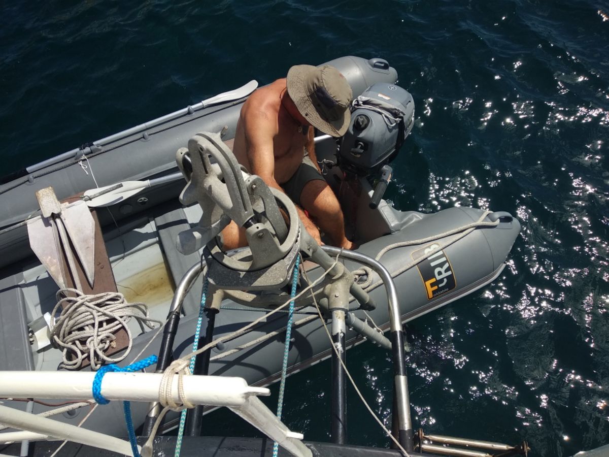 Dienstag ist Arbeitstag auf dem Boot. Unser Paket mit den Ersatzteilen ist nach 4 Wochen immer noch nicht angekommen. Thomas repariert den Wasserauslass des Motors mit einem dicken Schlauch und Sikaflex. Dafür leiht er sich das Dingi der schicken Ami-Yacht „High Cotton“ aus, damit wir unsere Banane nicht extra aufbauen müssen. Die Windsteuer-Anlage am Heck läuft nicht rund, sie wird neu justiert und gewartet, weil die Position vom Beiboot aus gerade so gut ist. Unser Großsegel muss neu eingefädelt werden, nachdem der dicke Bolzen am Großbaum ausgetauscht wurde. Dann bringen wir das Ersatz-Großsegel an Land und messen es aus. Dabei stellen wir fest, dass es nichts mehr wert ist. Die Nähte sind morsch, schon mehrere Flicken drauf, das wird uns nichts mehr nützen. Check-Out im Marina-Office und bei der Immigration. Morgen sind wir frei, wir möchten mit der Walkabout nach Pico.