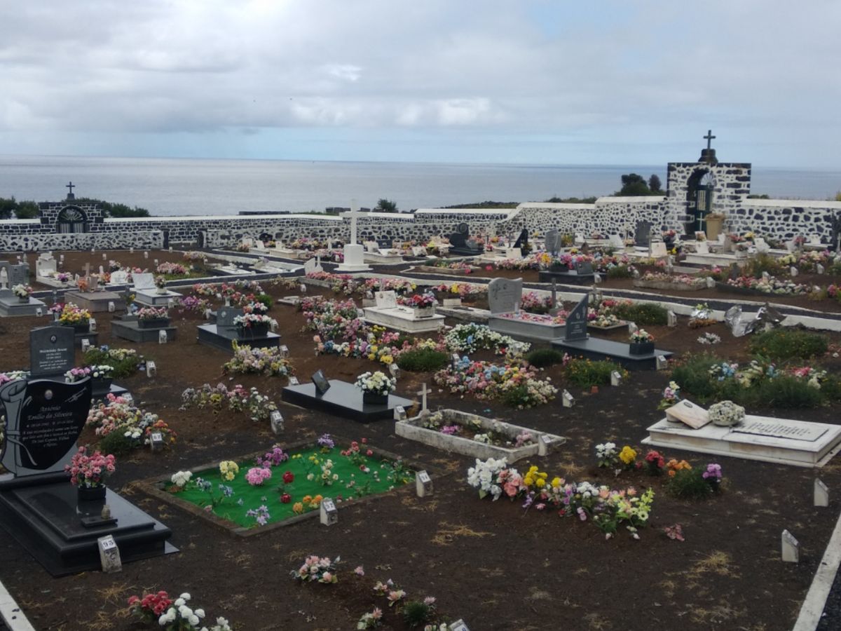 Sonntag fahren wir mit dem einzigen Bus bis nach Cascalhera, um dort eine Rund-Wanderung zu starten. Wie wir später zurückkommen, das wissen wir noch nicht. An der Straße oberhalb von Ribeiras gibt es einen Wal-Beobachtungspunkt, allerdings sind keine Wale in Sichtweite. Aus unserer erhöhten Position heraus haben wir freien Blick auf die Küste unter uns. Ausgedehnte Mais-Felder, viel Wald, Berge. Malerische Landschaft, offener und irgendwie ansprechender als Faial. Der Busfahrer schmeißt uns an der richtigen Stelle raus. Schon bald kommen wir an einer hübsch in weiß-blau angemalten Hütte vorbei, die ebenfalls der Wal-Beobachtung diente. Danach geht es sehr steil durch sorgsam angelegte Weinfelder abwärts. Dunkelblaue Weintrauben, die großzügig über die Straße hängen. Wir machen einen kleinen Abstecher zu einem Natur-Schwimmbecken mit Picknick-Platz und Grillstelle. Eine weitere rote Windmühle leuchtet in der Mittagssonne. Es folgt ein Friedhof voller bunter Kunst-Blumen. Das sieht ein wenig schräg aus, weil es wirklich sehr bunt und kitschig ist.