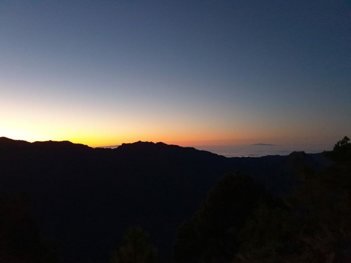 Wir fahren mit dem Nachmittags-Bus bis nach Fuencaliente. Nach dem Proviant-Einkauf stärken wir uns beim Abendessen in der „Cantina del Gladiatore“, einem urigen italienischen Restaurant mit ausgezeichneter Küche. Kurz bevor wir den Ort verlassen und in den Kiefernwald auf den Gr 131 einbiegen, steht ein Hiker-Denkmal am Weg. Schon nach etwa 5 Kilometern, kurz nach 20.00 Uhr, bauen wir etwas abseits vom Pfad unser Zelt auf – das erste Mal wieder nach langer Zeit. Teneriffa mit dem höchsten Gipfel Teide ist deutlich im Osten zu erkennen, es scheint ganz nahe zu sein. Dichter Nebel zieht auf und hüllt die Berge ein, gerade als unser Lager steht. Sehr helle Nacht, sternenklarer Himmel und Vollmond. Dazu ist es absolut still im Wald um uns herum.