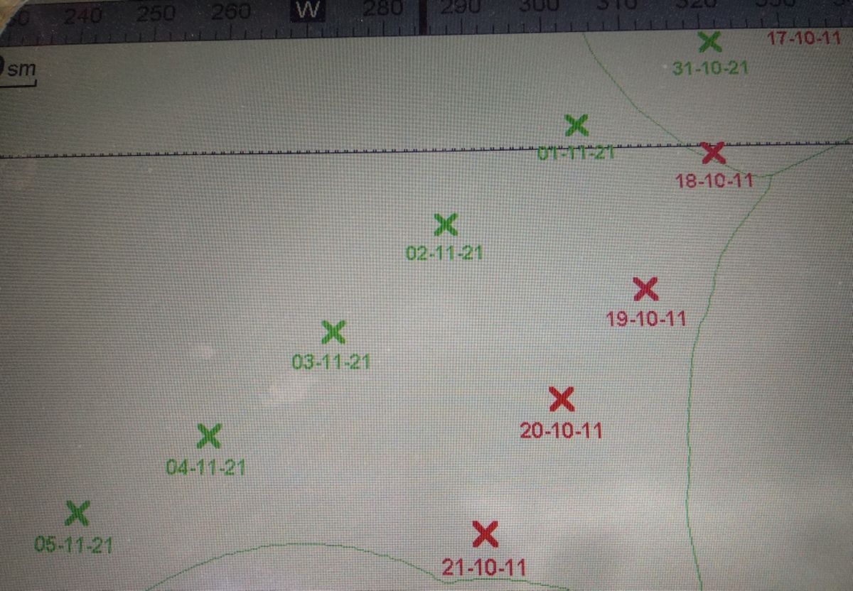 Abends gegen 21.00 Uhr sichte ich beim Rundum-Blick ein grünes Licht an steuerbord achteraus. Es scheint zu blinken, genau wie eine beleuchtete Steuerbord-Tonne. Aber das ist ja Quatsch, hier gibt es doch nichts außer Wasser ! Unser Plotter zeigt kein AIS-Signal an. Dann ist das grüne Licht plötzlich wieder weg. Ausgestellt ? Thomas hat es auch deutlich wahrgenommen. Vielleicht ein Fischer oder Segler, der nicht gesehen werden möchte ? Sehr merkwürdig.