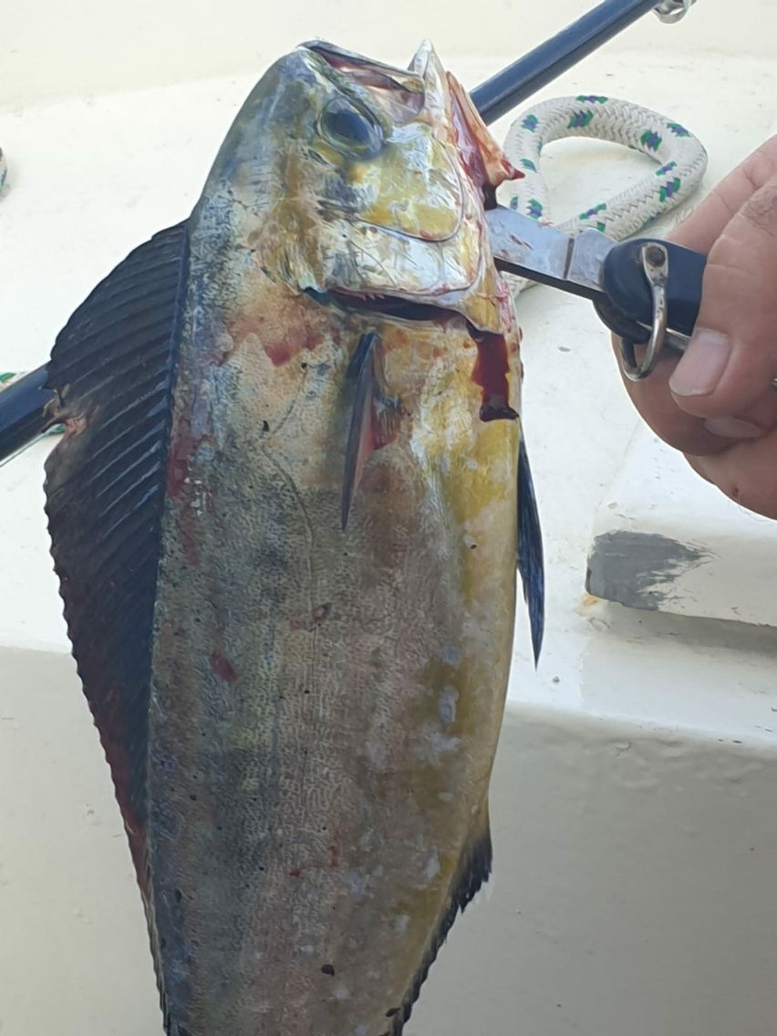 Zunächst einmal möchten wir Ruhe ins Schiff bekommen. Wir drehen bei und lassen uns treiben. Platz genug ist da, keine Küste und keine anderen Schiffe in Sicht. Thomas bastelt an der Windsteuerung. Beim Zusammensetzen der Aries verabschiedet sich die Flügelschraube, mit welcher die Windfahne an der Anlage befestigt wird. Ab in die Tiefen des Atlantiks …. und tschüss. Wie lange das wohl dauert, bis die auf dem Meeresgrund ankommt ? Ich bin total erschrocken, weil ich denke, dass dieses wichtige Ding unersetzlich ist. Halb so schlimm, wir haben zwar kein Original-Ersatzteil, aber es findet sich eine passende Schraube ohne Flügel. Gerade als wir nach 2-stündiger Unterbrechung wieder Fahrt aufnehmen wollen, da bemerkt Thomas ein langes Seil im Wasser neben unserem Boot. Das können wir uns nun gar nicht erklären, denn bei uns scheinen alle Leinen ordentlich an Bord zu sein. Haben wir uns da etwas unter dem Kiel eingefangen ? Auf jeden Fall muss das da weg. Wir versuchen es mit dem Bootshaken, aber kommen nicht dran, der Weg ist zu weit. Kurzentschlossen steigt Thomas auf die Badeleiter am Heck. Ich finde es ziemlich gruselig, dass er mitten im Atlantik „aussteigen“ will, aber natürlich ist er mit Gurt an der Leiter gesichert. Als er die Leine endlich am Haken hat, da staunen wir nicht schlecht, denn es ist unsere eigene Angelschnur. Durch das Beidrehen ist sie wohl mehrmals unter unserem Schiff durch oder wir sind drüber getrieben, dabei hat sie sich irgendwo festgehängt. Kleine Nachlässigkeiten werden an Bord sofort bestraft, größere dürfen gar nicht erst passieren. Die Wasser-Brechung, der tiefblaue Ozean und die Sonneneinstrahlung haben die Perspektive so verändert, dass unsere dünne Angelschnur wie eine Festmacher-Leine aussah. Wie doof kann man sein ? 😉 Die Angel wird aufgedröselt, ein Stück davon abgeschnitten, dann gleich wieder ausgeworfen. Es dauert keine 10 Minuten, da gibt es einen heftigen Ruck, der auf einen größeren Brocken schließen lässt. Das gibt’s doch nicht – wir stecken noch mitten im Chaos und sind noch nicht fertig mit Aufräumen. Aber nun ist er dran, ein dicker Mahi-Mahi von etwa 50 Zentimetern Länge. Das Abendessen ist gesichert. Unser Fisch wird sofort ausgenommen und in Filets zerlegt. Danach muss alles abgewaschen und die Plicht geputzt werden. Es dauert lange, bis an Deck wieder aufgeklart ist. Freiwache ist fast zu Ende.