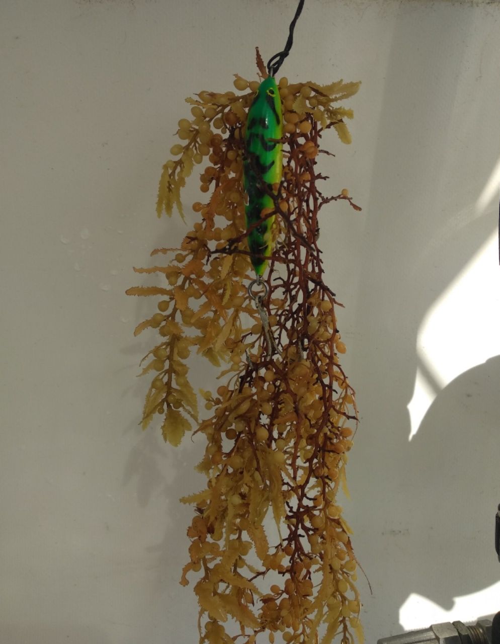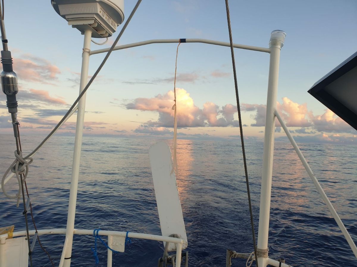 Bereits früh am Morgen Begegnung mit einem großen dunklen Fisch, der uns entgegen schwimmt. Könnte ein Grindwal sein, man sieht zu wenig, um es genau zu bestimmen. Er taucht mehrmals kurz auf, verschwindet aber gleich wieder, ohne dass man viele Details erkennt. Zwei Stunden später hört Thomas das Geräusch von einem Blas an steuerbord. Wir werden in nur etwa 5 Meter Abstand von einem Wal überholt. Zielstrebig schwimmt er an uns vorbei, geht nicht in die Tiefe, sondern zeigt sich mehrmals an der Wasseroberfläche. Nicht lange danach zieht genau so ein Wal an backbord in der anderen Richtung vorbei. Es wird vermutlich derselbe gewesen sein, der eine Runde um unser Boot gedreht hat. Am Nachmittag beobachtet Thomas einen riesigen Tunfisch von ca. 1,50 Meter Länge. Der springt senkrecht hoch aus dem Wasser, dreht sich in der Luft und taucht wieder ein. Für unsere Angel wäre der ein bisschen zu groß, da beißt schon seit Tagen keiner mehr an. Überall im Wasser treibt Saragossa-Gras. Blöd, wenn es sich an der Angel festhängt und einen guten Fang vortäuscht. Heute wäre gerne mal wieder Fisch erwünscht, denn der Speiseplan wird etwas einseitig. Wir teilen uns den letzten Apfel. Drei Orangen und zwei vertrocknete Zitronen haben wir noch, danach gibt es Obst nur noch aus der Dose.