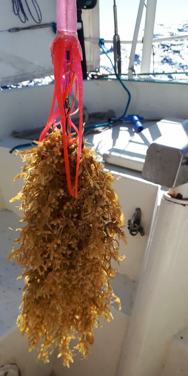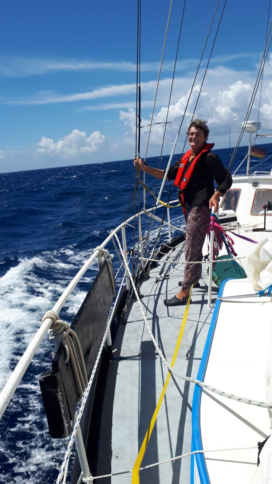 Tagelang kein Wölkchen am Himmel. Der Ozean erscheint tiefblau und leuchtet in der Sonne. Schwimmen ist trotz Windstille unmöglich, denn im Wasser wimmelt es von Portugiesischen Galeeren. Berührungen mit den Tentakeln dieser Quallen sind für Menschen äußerst schmerzhaft und langanhaltend. Das Gift kann sogar einen allergischen Schock mit Atemstillstand und Herzversagen hervorrufen. Nachmittags gibt es deswegen Eimer-Dusche auf dem Vordeck. In einiger Entfernung treibt ein hellblauer Gegenstand, sieht aus wie ein Kanister oder ein Fass. Ansteuerung und Herausfischen mit dem Bootshaken klappt im zweiten Anlauf. Es handelt sich um eine leere Gas-Flasche aus Metall. Die nehmen wir mit, die gehört nicht ins Meer. Ein großer Schwarm Tunfische überholt uns an steuerbord. In einer langen Reihe und mit erstaunlicher Geschwindigkeit bewegen sich die Fische voran, tauchen aus dem Wasser und wieder unter. Sind die auf der Jagd ? Oder werden die gerade selber gejagt ? Bei uns beißen die Fische nicht mehr, dafür haben wir ständig Seegras an der Angel. Zappenduster ist es beim Abendessen um uns herum, dafür ist es morgens um 4.00 Uhr zu Beginn meiner Früh-Wache bereits taghell. Okay, die Zeichen sind deutlich, die Bordzeit sollte angepasst werden. Zunächst einmal stellen wir alle Uhren um zwei Stunden vor, das müsste die Hälfte der gesamten Verschiebung sein. Hell wird es ab jetzt um 5.30 Uhr, da kann unsere innere Uhr besser mit umgehen. Jede Nacht leuchten Milliarden von Sternen an einem klaren Himmel. Im Minutentakt kann man herabstürzende Sternschnuppen sehen.