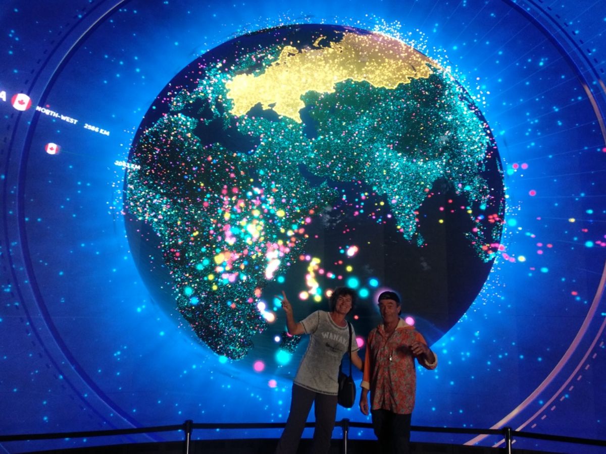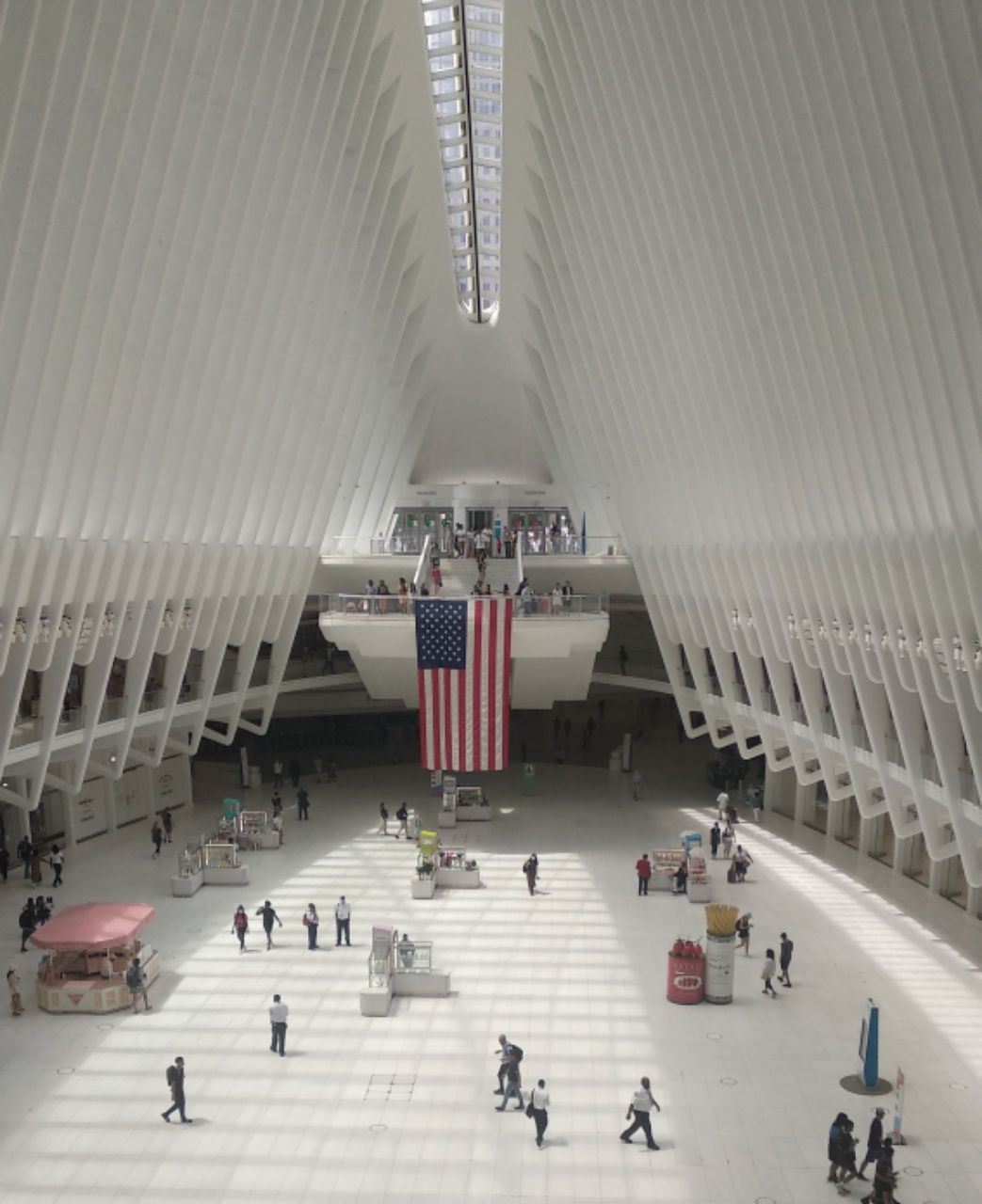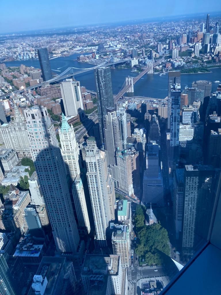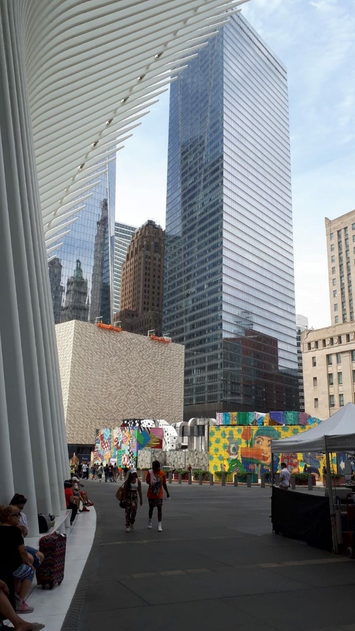 Einige Metro-Abenteuer weiter, dann haben wir die Haltestelle vom Bus gefunden. Hop on – Hop off der zweite Teil, diesmal fahren wir die blaue Route „uptown“. Nachmittags besuchen wir das World Trade Center. New Yorks höchste Aussichtsplattform ist das „One World Observatory“. Es ist mit moderner Technik ausgestattet. Schon der Weg zur 100. Etage macht Spaß, denn im Fahrstuhl läuft eine beeindruckende Lichter-Show. Es geht über Treppen noch zwei Stockwerke höher. Oben kann man den 360° Rundum-Blick in entspannter Atmosphäre genießen. Aussicht von so weit oben haben wir nun schon zum dritten Mal, das Besondere hier ist die andere Perspektive. Wir sind gerade zur richtigen Zeit da, um einer interessanten Vorführung zu lauschen. Die Geschichte New Yorks wird uns nähergebracht. Wir hören spannende Sachen über die verschiedenen Stadtteile, deren Unterschiede wir ja bereits selber bemerkt haben. Das „One World Trade Center“ rangiert in unserer Gunst im Mittelfeld zwischen „Top of the Rocks“ und „Edge“.