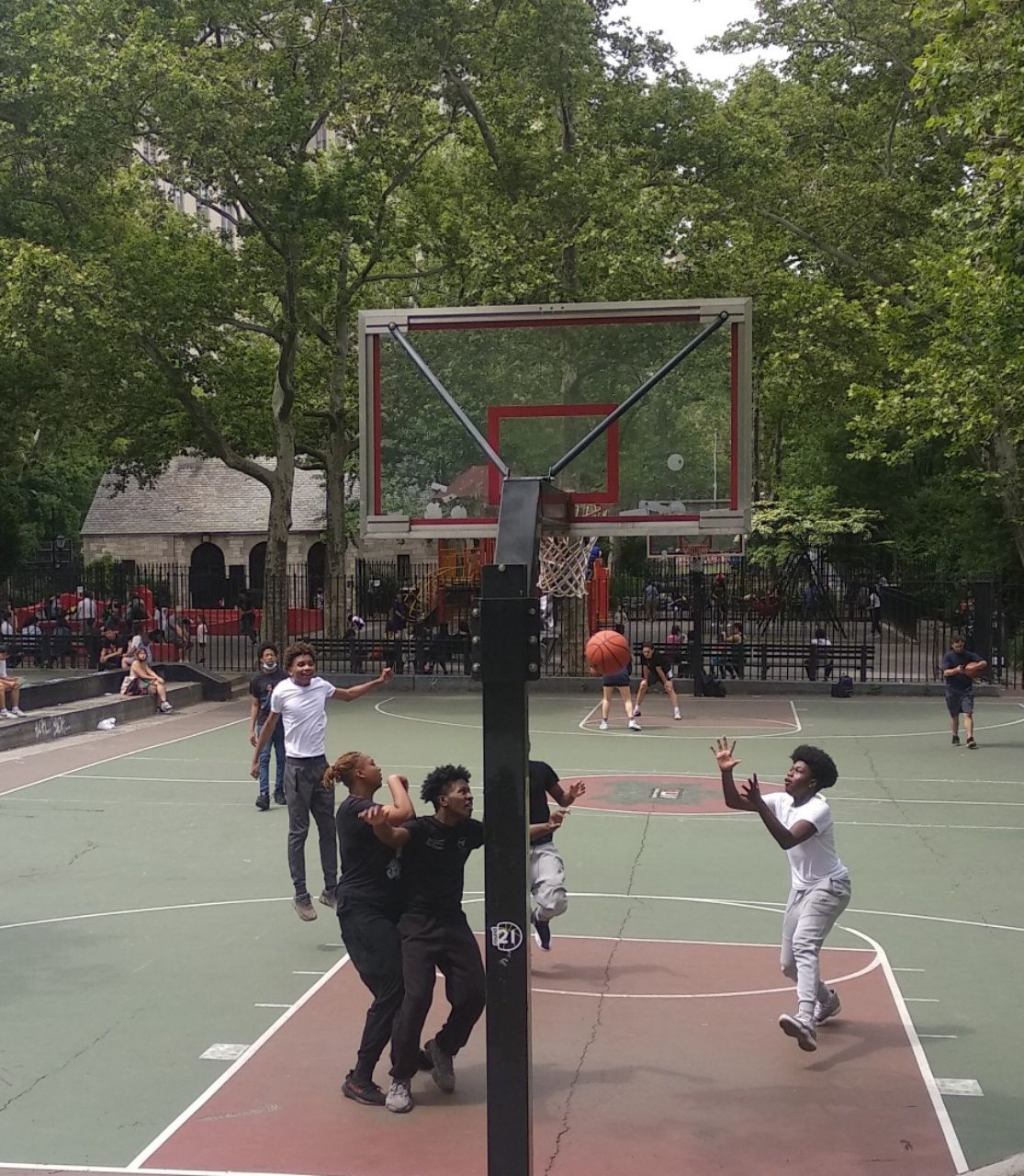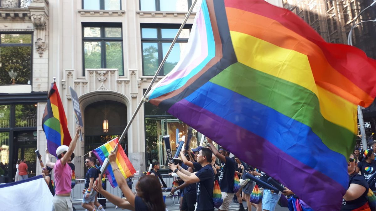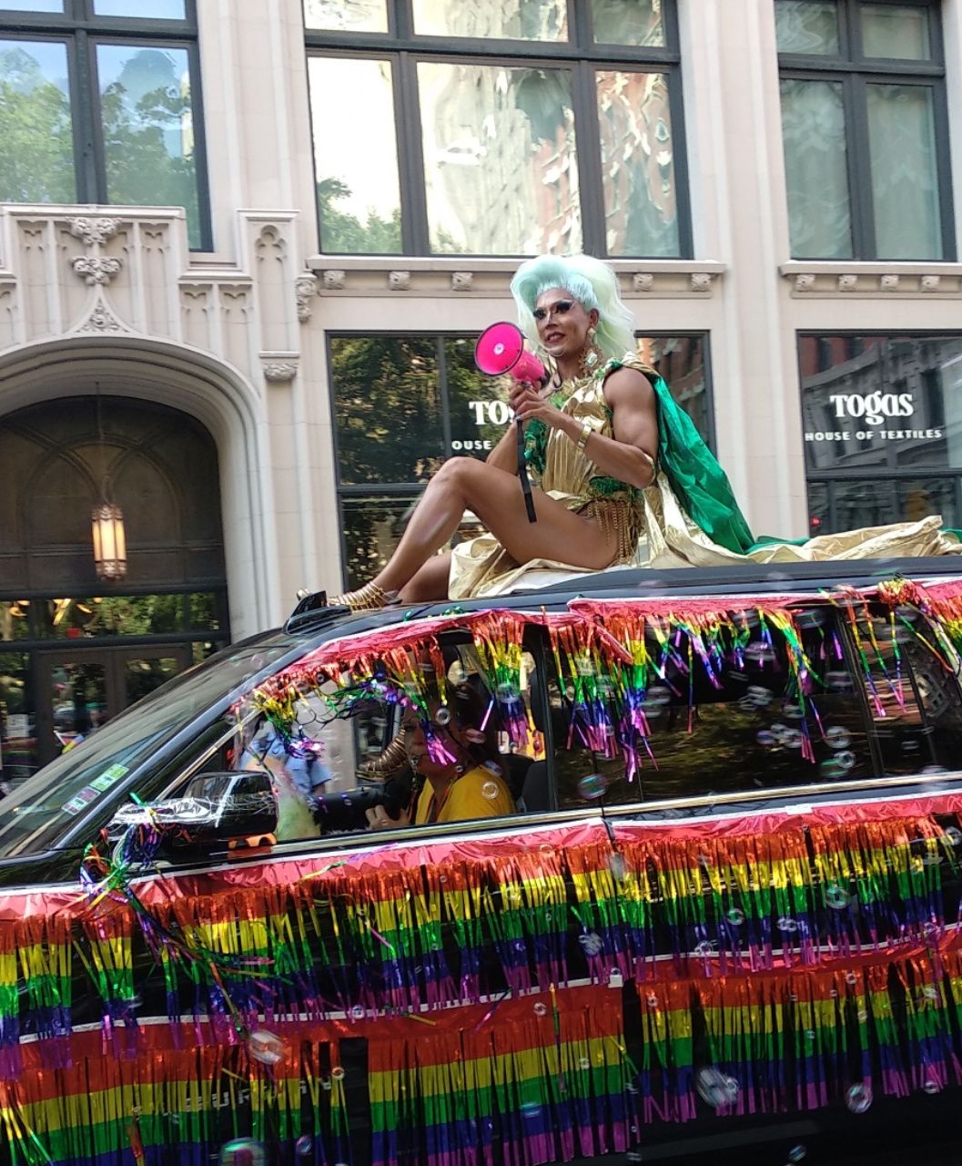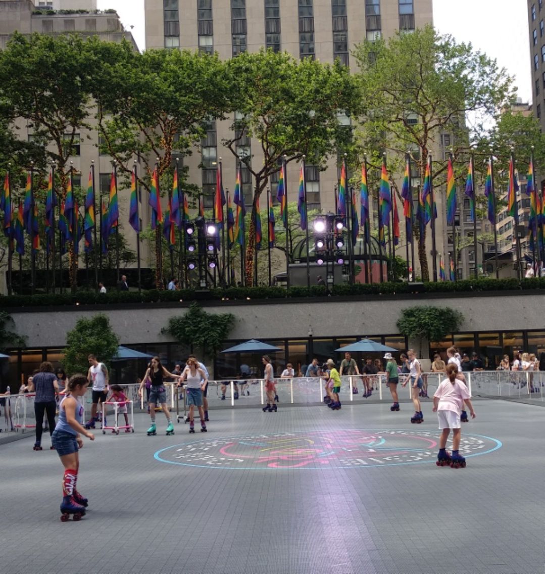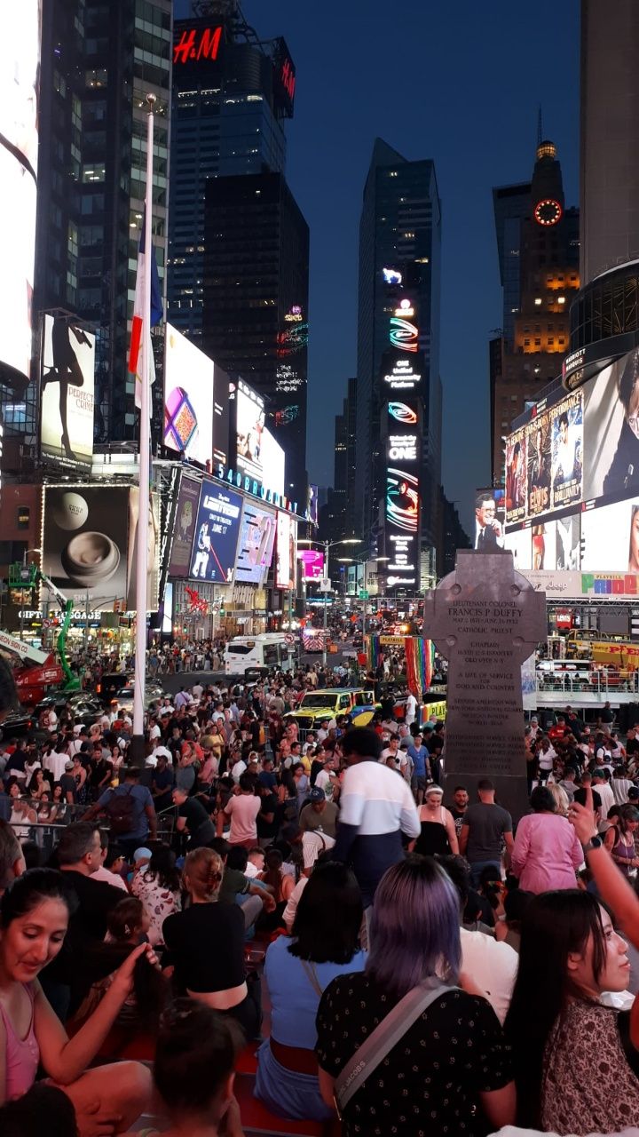 Danach spazieren wir ein Stückchen am Rande des Central Parks. Die „grüne Lunge“ New Yorks ist sechs Mal so groß wie Monaco, 340 Hektar Grünfläche, 75 Kilometer an Wegen, 9000 Bänke stehen hier. Zum Fahrrad-Ausleihen ist es schon zu spät. Alternativ-Plan ist der Zoo. Dafür steigen wir in den nächsten Bus, immer entlang des riesigen Central Parks. Stehen dort kurz an, aber ohne Reservierung dürfen wir nicht hinein. Kapazität ausgelastet, für heute werden keine Besucher mehr eingelassen. Schade. 🙁 Dafür geraten wir in eine Pride-Parade. Der New York City Pride March ist eine Veranstaltung zur Feier der LGBTQ-Gemeinschaft. Es ist die größte Zusammenkunft dieser Art in der Welt, die jedes Jahr Zehntausende von Teilnehmern und Millionen von Zuschauern anzieht. Wir sind Zaungäste einer einzigartigen Party auf der Straße und erleben eine durchweg friedliche Veranstaltung, vielleicht vergleichbar mit dem Woodstock-Festival. „Peace and Love“, alles im Zeichen des Regenbogens. Wahrscheinlich ist das Leben und Treiben auf der abgesperrten Straße viel bunter als der Zoo. 😉