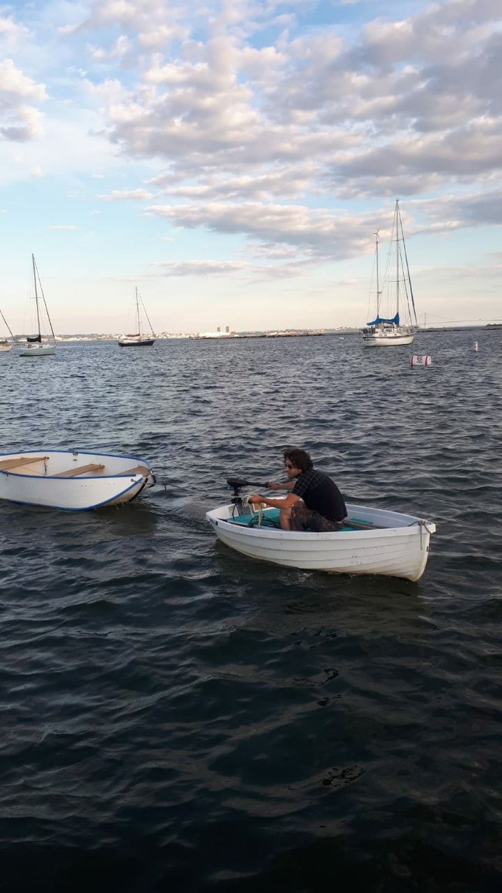 Jonathan möchte gerne gegen 18.30 Uhr im Hotel sein. Das lässt sich leicht verwirklichen, denn wir haben eigentlich auch genug gesehen. Die Fahrt zurück bietet einige Überraschungen. Dachten wir gerade, wir haben es gecheckt, so gibt es am Sonntag einen ganz anderen Fahrplan. Unbekannte Wege, in New Jersey dann noch Umsteigen in einen Bus, der uns zur Haltestelle am State Park bringt. Schienen-Ersatzverkehr heißt das bei der Deutschen Bahn und dauert immer etwas länger. Am Ankerplatz stehen drei Polizei-Wagen, auch das haben wir während der Woche noch nicht erlebt. Schwimmen ist eine ganz schlechte Idee, wenn man so auf dem Präsentierteller ist. Die Polizei-Fahrzeuge an der Landestelle kontrollieren die Tickets der Wassersportler genau und scheinen heute damit nicht fertig zu werden. Thomas ruft Roman an. Der ist hilfsbereit wie immer, nur leider geht ihm sein Beiboot stiften, bevor er einsteigen konnte. Der Wind treibt das Dingi langsam in Richtung Ufer, wo Thomas es dann „einsammeln“ kann. Passt. 🙂