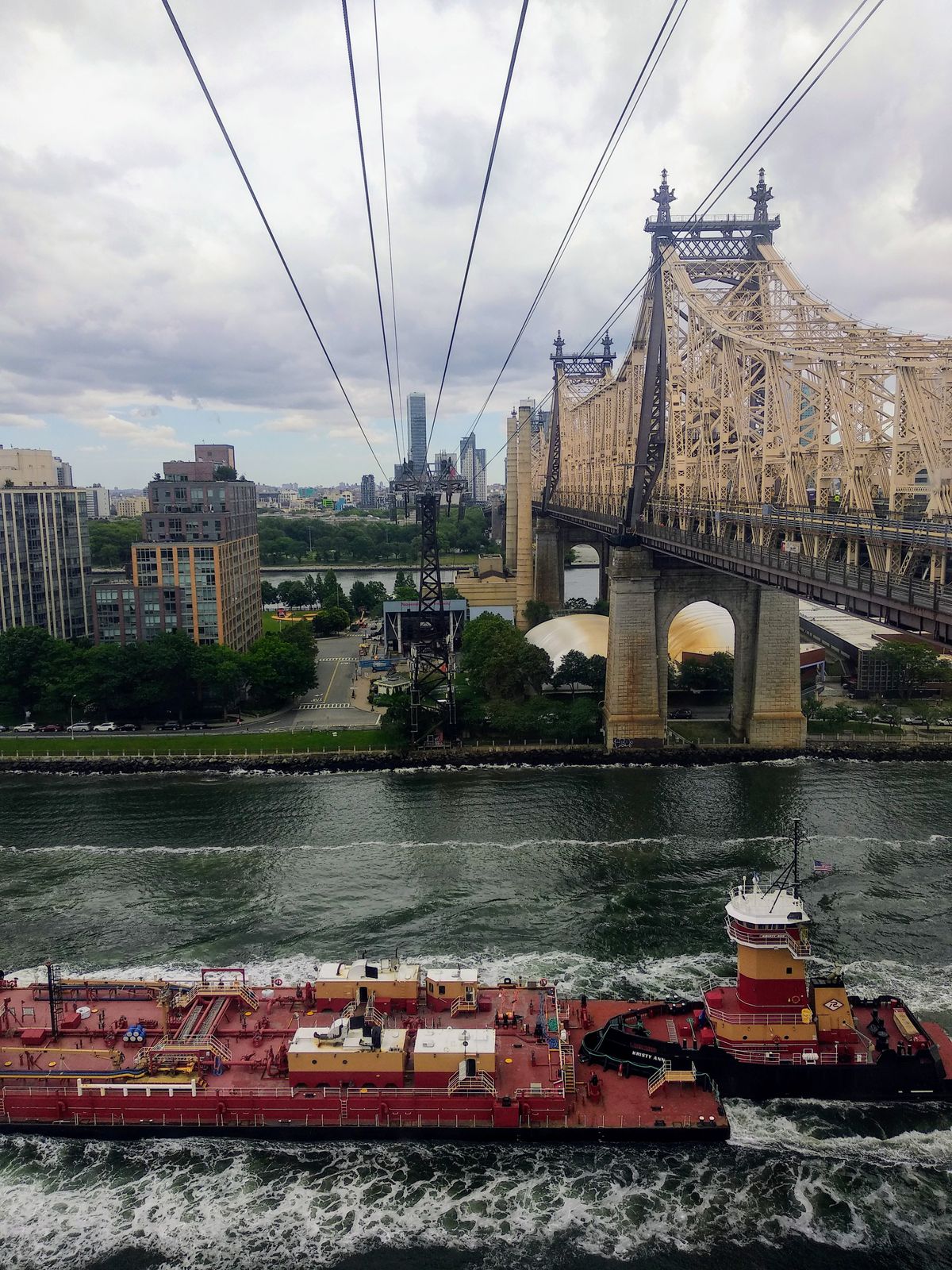 Fußweg, dann Light Rail, U-Bahn, S-Bahn …. Die Grenze zwischen New Jersey und New York verläuft mitten durch den Hudson River. Es ist ein langer Weg bis Downtown. Kostet jeden Tag 20,- $ hin und zurück, obwohl wir eine Wochenkarte für die Metro gelöst haben. Unser Ankerplatz im Liberty State Park liegt weit außerhalb, ist aber dafür umsonst. Bis in die City brauchen wir ungefähr 1,5 Stunden. Wir möchten ein weiteres neues Verkehrsmittel ausprobieren. Es gibt eine Schwebebahn über den East River bis nach Roosevelt Island. Gedacht, getan ….