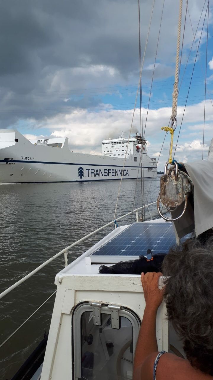 Regen und Gewitter konnten uns nicht weiter stören. Morgens ist es grau und nieselig. Slalom-Fahrt um die Plastik-Markierungen herum. Außerdem treibt am Eingang unserer Bucht sehr viel Holz, das wahrscheinlich durch die Unwetter der letzten Nacht angespült wurde. Wir fahren früh los, denn wir haben uns eine lange Strecke vorgenommen. Zunächst durch den nördlichen Teil der Chesapeake Bay, danach eventuell noch weitere 3-4 Stunden durch den Chesapeake-Delaware-Kanal. Auf den vorgelagerten Sandbänken ist schon richtig was los. Wir zählen ungefähr 20 Motorboote, die hier am Wochenende ihrem Angel-Hobby nachgehen. Mittags kommt die Sonne heraus, es wird wieder heiß. Die Chesapeake Bay verjüngt sich nach Norden, die Fahrrinne wird immer schmaler. Der Susquehanna River ergießt seine Wassermassen in die Bucht. Mit über 700 Kilometern ist er der längste an der Ostküste mündende Fluss in den Vereinigten Staaten. Es geht nur langsam vorwärts. Dann endlich können wir einer Straße mit dicken Fahrwasser-Tonnen folgen, die ausnahmslos mit Nestern besetzt sind. Hier stehen die roten und grünen Bojen sogar an der „richtigen“ Seite. Nach 6 Stunden haben wir den Anfang des Kanals erreicht. Passt gut. Sehr schön grün ist es zu beiden Seiten, nicht verbaut mit exklusiven Villen. Dafür sehen wir viel Wald, Fahrrad- und Wanderwege. Gefällt mir eindeutig besser als die Ufer entlang der Chesapeake Bay mit den Prachtbauten der Superreichen. 14 Meilen lang, 130 Meter breit und mehr als 12 Meter tief ist die Verbindung zwischen Delaware River und der Chesapeake Bay. Unterwegs gibt es keine Möglichkeit zum Stoppen oder Ankern, mit Ausnahme einer teuren Marina. Wir schaffen es gut bei Tageslicht. Insgesamt 5 Brücken auf dieser Strecke, die alle für größere Schiffe gemacht sind. Wir passen also locker durch, ohne die Geschwindigkeit zu vermindern. Mit-Strömung verhilft uns zu mehr als 7 Knoten Fahrt. 🙂 Ein Ozeanriese kommt uns entgegen, die „Timca“ mit Heimathafen Amsterdam. Dieses Frachtschiff hat eine Länge von 205 Metern, ist knapp 30 Meter breit und hat 8 Meter Tiefgang. Da fühlen wir uns mit der Walkabout ganz klein und drücken uns an den äußersten Rand.