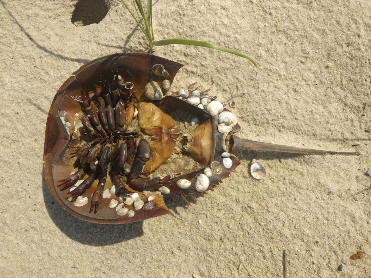 Das Wetter bleibt nicht länger so friedlich. In der zweiten Nachthälfte frischt der Wind auf. Die Delaware Bay ist groß und bietet viel Angriffsfläche. Anker ist auf einer Wassertiefe von 3,70 Metern gefallen. Die Walkabout zerrt an der Kette und dreht sich. Wir stampfen auf und nieder, vorne im Bug ist an Schlaf nicht mehr zu denken. Unseren Morgen-Kaffee trinken wir im Deckshaus. Draußen ist es grau, erst Regen, dann Gewitter. Wir haben 20 Meter Kette draußen. Lehm und Schlick sind ein guter Haltegrund. Auf dem Plotter können wir beobachten, dass wir uns nicht vom Ankerpunkt entfernen, sondern nur auf der Stelle tanzen. Alles gut. Noch müssen wir warten, bis die Tide kippt und die Gegenströmung nachlässt. Der Wind bleibt kräftig, Wellenhöhe steigt. Die aufgewühlte See macht das Leben an Bord etwas schaukelig. Macht schon keinen Spaß mehr, sich unter Deck aufzuhalten. Aufbruch eine Stunde früher als geplant, bevor wir am Anker seekrank werden. Gegen Wind und Strom schaffen wir nur 2,5 Knoten, aber die Schiffs-Bewegungen sind angenehmer. Der Himmel im Westen wird immer dunkler, da braut sich was zusammen. Keine Viertelstunde nach diesem Gedanken geht es los. Zunächst Regen mit noch mehr Wind, dann Blitz und Donner. Der Himmel präsentiert sich jetzt ringsum dunkelgrau, auch da, wo es vor wenigen Minuten noch hell war. Die Sicht wird immer schlechter. Niemand wird sich bei diesem Sauwetter im flachen Wasser herumtreiben – so hoffen wir wenigstens. Für große Pötte sowieso unmöglich, die werden schön im tiefen Fahrwasser bleiben. Funk-Antenne ist abgeklemmt, auch das AIS stellen wir aus, als das Gewitter sehr nahe ist. Kabbeliger Seegang, Wind von vorne, unser Kurs ist schwierig zu halten. Irgendwann hilft die Strömung mit und schiebt, so kommen wir mit 4-5 Knoten voran. Und dann Regen, Regen, Regen. Die Wellen werden plattgedrückt, das ist gut für uns. Nass werden wir nicht, weil wir aus dem Deckshaus steuern. Gegen 13.00 Uhr ist das Unwetter durchgezogen, diesmal ganz ohne Aufregung. 🙂 Frühstück ist ausgefallen, das holen wir nach. Um 15.00 Uhr haben wir unser Ziel erreicht : Lewes. Wir queren die Route der Fähre von Cape May und tuckern langsam in Richtung Strand. Eine lange Mole, ein „Breakwater“, schützt vor Wind und Schwell. Einfach genial. 🙂 Der Anker fällt genau bei Niedrigwasser auf 1,90 Meter. Zack – das Boot steht sofort. 1,60 Meter Tidenhub, die kommen dann mit dem auflaufenden Wasser noch dazu. Wir paddeln direkt zum Sandstrand. Dort liegen seltsame Geschöpfe, wie wir sie nie zuvor gesehen haben. „Limulus polyphemus“. Das sind Pfeilschwanz-Krebse, die an der amerikanischen Atlantikküste und am Golf von Mexiko vorkommen.