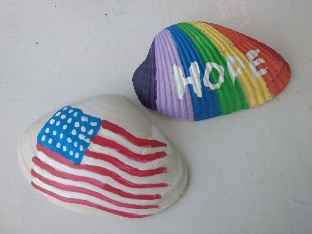 Den nächsten Übergang nehmen wir in Richtung Wald. Dabei kommen wir an einem Imbiss vorbei, wo es lecker riecht. Es ist Mittagszeit – der Magen meldet sich. Aber der Appetit vergeht ganz schnell wieder, als ich die Preise sehe : Portion Pommes für 8,- Dollar. Natürlich haben die Kartoffelschnitze einen teuren Namen, die heißen nämlich hier „Beach Fries“. 😉 Darauf können wir verzichten, weil wir eigenen Proviant im Rucksack mitgebracht haben. Es gibt mehrere Wanderwege im Henlopen State Park. Wir laufen eine Runde auf dem „Pinelands Nature Trail“. Das ist ein schöner Loop durch Kiefernwald, nicht besonders anspruchsvoll. Trotzdem treffen wir nur ein einziges Paar, das bald abbiegt zum Parkplatz. Unterwegs finden wir eine Bank im Schatten, wo wir Rast machen und unser mitgebrachtes Mittagessen verzehren. Schon nach kurzer Zeit bemerkt Thomas eine Zecke an seinem Bein, dann noch eine und noch eine …. Schnell erkannt und schnell entfernt, trotzdem krabbelt es nach wenigen Minuten weiter. Ich habe eine angeblich Insekten-sichere lange Hose an, Thomas entdeckt zwei Zecken darauf. Wir essen schnell, und dann nichts wie weg. Unser Rundgang führt weiter zum Fort Miles, an dem früher 2500 Soldaten stationiert waren. Die Baracken-Siedlung ist noch sehr gut erhalten, als könnten dort morgen wieder Menschen einziehen. Im Außenbereich des Museums stehen Kanonen, deren Geschütze laut Informationstafel so schwer wie ein Nilpferd sind. Mehrere Bunker liegen am Rande des Weges, aus der Luft nicht erkennbar, weil die Dächer komplett begrünt sind. Überbleibsel aus dem Zweiten Weltkrieg. Die Gedanken schweifen zur Ukraine, wo Angst und Gewalt seit vier Monaten an der Tagesordnung sind. 🙁 Wir steigen auf einen Beobachtungs-Turm mit Schießscharten. Von oben kann man den gesamten Park überblicken. Ein Stück weiter steht ein anderer Turm, der allerdings keinen Zugang gewährt. Oben auf dem Geländer sitzen schwarze Greifvögel, die wohnen anscheinend dort. Anschließend spazieren wir zum Campingplatz und nutzen die warmen Duschen. Alles dabei : Shampoo, Seife, Handtücher. 🙂 Ich möchte gerne noch das Biden Center besichtigen. Wir finden es nicht sofort, haben auf dem Campingplatz irgendwie die Orientierung verloren. Die Strecke zieht sich, eigentlich haben wir genug. Zu guter Letzt stehen wir vor dem Gebäude, welches mit einem hohen Zaun umgeben ist. Leider wegen Revovierungsarbeiten geschlossen. Unser Weg war umsonst. Nein, nicht ganz, denn auf einer Schautafel wird die Geschichte des Hauses erklärt. Nun wissen wir, dass dieses Gebiet im Zweiten Weltkrieg unter Militär-Kontrolle geriet. Biden ist ein „Kind“ des Bundesstaates Delaware. Schon 1998 sorgte er dafür, dass das Land ( und viel mehr als vorher ) zurückgegeben wurde. Daraus ist dann der Cape Henlopen State Park entstanden. Ein schönes Foto zeigt Joe Biden zusammen mit dem damaligen Direktor der Delaware State Parks bei der feierlichen Eröffnung. Auf dem Rückweg finden wir bunt bemalte Muscheln, eine mit der Flagge der USA, ein paar Minuten später eine weitere Muschel in Regenbogen-Farben. Wir nehmen sie mit und werden sie an anderer Stelle wieder auslegen, damit sich der nächste Finder freuen kann.