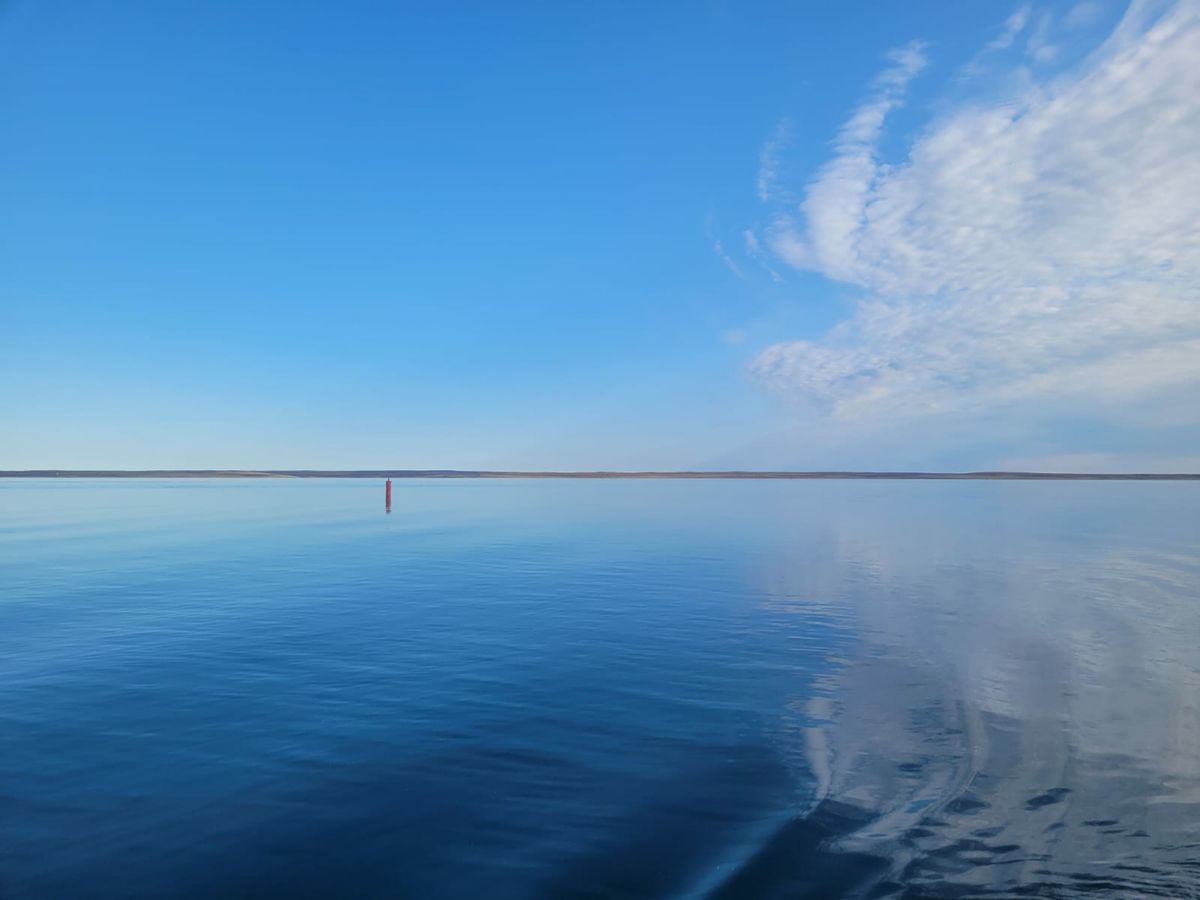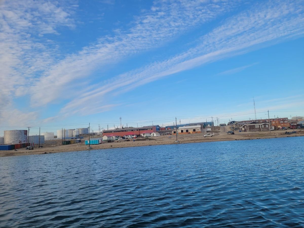 Alles sehr friedlich bei der Anfahrt nach Cambridge Bay. Von Wind ist noch gar nichts zu spüren. Spiegelglatt ist das Wasser in der Bucht. Nacheinander kommen mehrere Motorboote mit interessierten Menschen zu uns, während wir durch die 10 Seemeilen lange Einfahrt Richtung Hafen tuckern. Die Leute möchten wissen, wer wir sind, wohin wir fahren, woher wir kommen …. „Das ist aber weit weg !“ 😉 Man redet hier also bereits vor der Ankunft mit den Einheimischen.