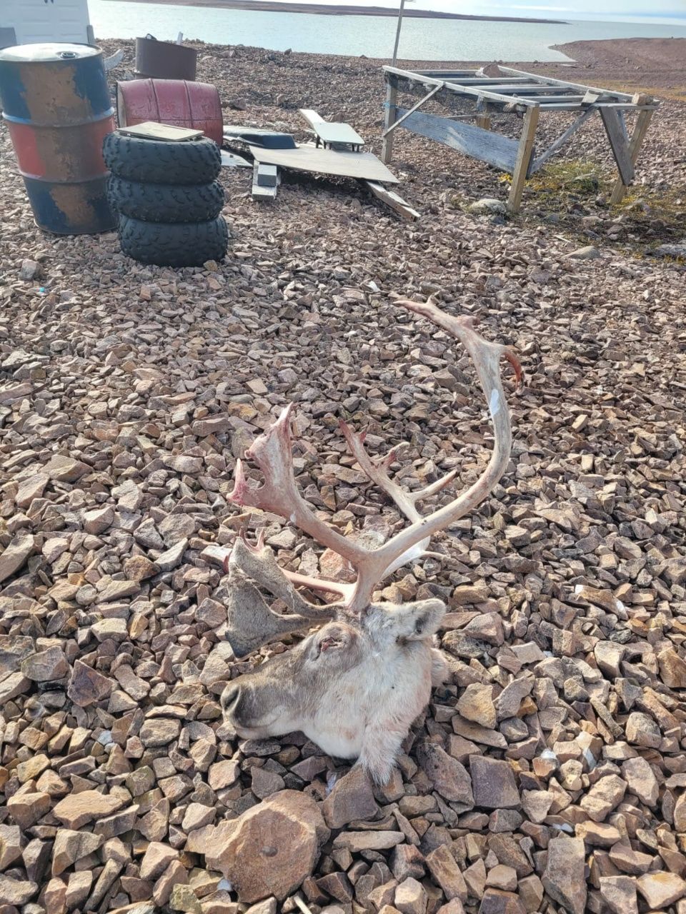 Karibu-Geweihe sind in einem wilden Haufen aufgestapelt. Wenn die alle hier geschossen wurden, dann gibt es bestimmt nicht mehr viele Tiere in diesem Gebiet. Da liegt sogar ein Karibu-Geweih komplett mit Kopf, Fell und Fleisch dran. Brrrr – ich könnte gerne zum Vegetarier werden.