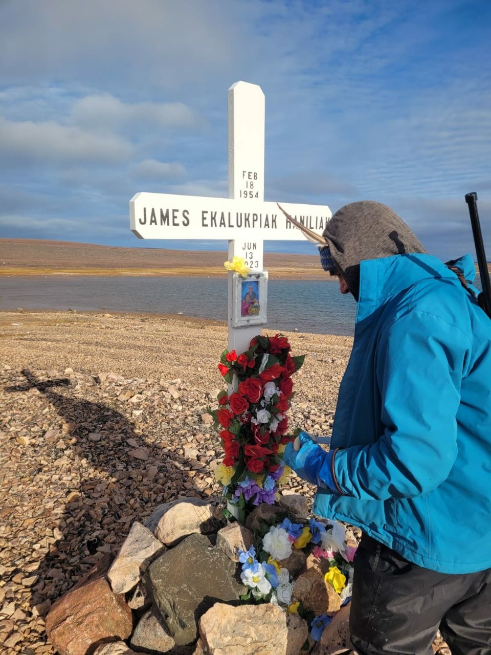 Zunächst laufen wir mit Gummistiefeln durch Sumpf. Von überall rinnt Wasser in die Bucht, der Boden taut jeden Tag mehr auf. Wir wandern um die Landzunge, auf der eine Hütte steht. Sehr gepflegt, das wirkt ziemlich wohnlich. Die Besitzer haben sogar ihren Müll gesammelt und auf einen Reiseschlitten geladen, wahrscheinlich um ihn irgendwann abzutransportieren. Das ist hier eigentlich nicht üblich, weder in Grönland noch in der kanadischen Arktis. Normalerweise wird der Sperrmüll einfach liegen gelassen und die meiste Zeit des Jahres mit Schnee bedeckt. Neben dem Häuschen befindet sich eine Grabstelle. Ein Holzkreuz mit Name, Datum und Foto eines glücklichen Ehepaares. Der Mann ist erst in diesem Jahr verstorben. Was für ein exklusiver Ort für eine Bestattung !