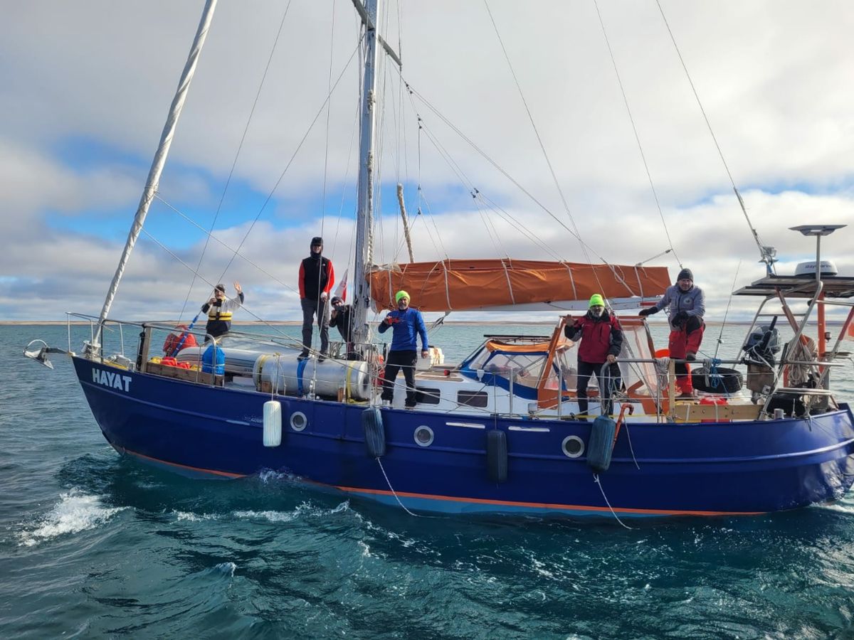 Bellingshausen legt direkt nach uns ab, überholt natürlich bald und verschwindet aus unserem Sichtfeld. Dafür kommt uns die Hayat entgegen, gerade bei der Einfahrt in die Bucht. Wir begegnen uns ganz dicht Seite an Seite. Lautes Jubeln und Winken bei der 6-köpfigen Crew. Super Stimmung, die freuen sich auf zwei Pausentage in Cambridge Bay.
