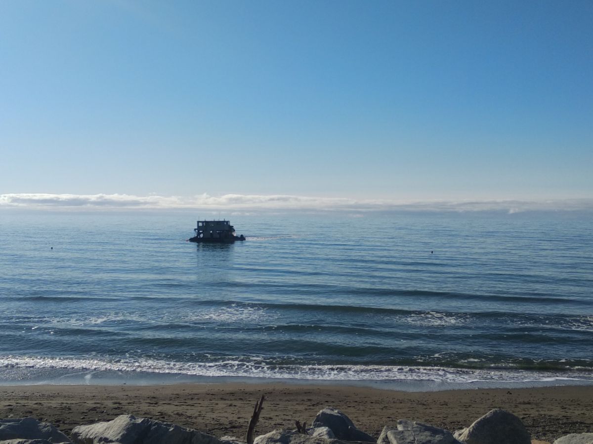 Komische Vehikel ziehen langsam ihre Kreise in Strandnähe. Es dauert einen Moment, bis bei uns der Groschen fällt. Das sind Gold-Bagger, die sogenannten „Dradgers“. Wir sind gleich da, in der Stadt der Goldgräber.