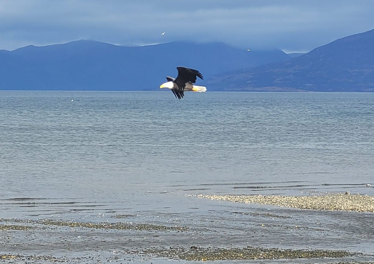 Homer ist ein relativ großer Ort in Alaska mit 5500 Einwohnern. Bekannt für Heilbutt und Austern, Anziehungspunkt für Künstler. Es gibt mehrere Galerien und ein ziemlich touristisch aussehendes Dorf mit bunten Häuschen, ähnlich den Hummerbuden auf Helgoland. Aber davon sehen wir erstmal nichts aus der Nähe, nur bei der Anfahrt vom Wasser aus.