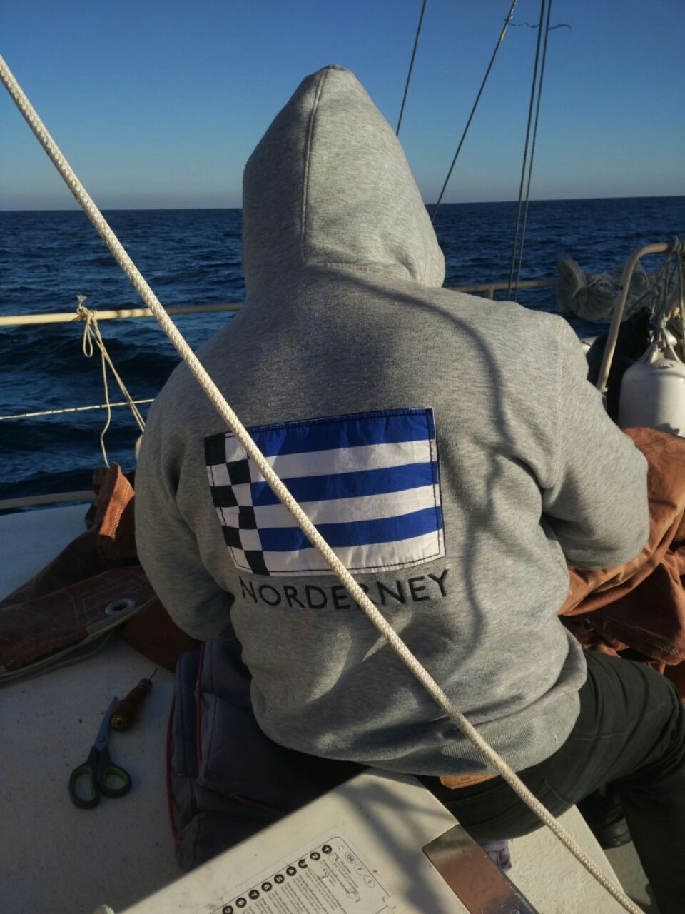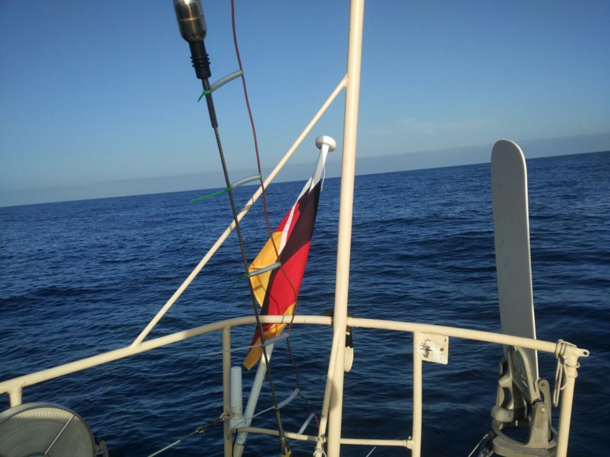 Viel Zeit zum Lesen, Schreiben oder für andere Dinge. Thomas bastelt einen Schutz für die Genua-Schot. Nun verhindern Hülsen aus Plastikschlauch um die Wanten, dass die Leinen dort scheuern. Rigg-Kontrolle, es wird noch einmal nachgeschraubt und die Spanner mit Splinten gesichert. Zwei Stagreiter am Vorsegel sind glatt durchgescheuert und werden ausgetauscht. Unter dem Motor findet sich etwas Öl, auch das wird genauer inspiziert. Offensichtlich ist alles okay. Um 18.00 Uhr meldet sich der Wind zurück, vorerst nur leicht, aber segelbar. Es geht weiter. Wir kommen voran, langsam, aber stetig.