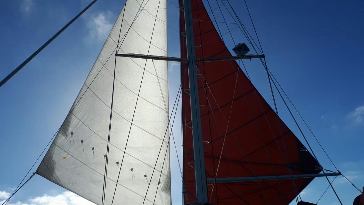 Thomas entschließt sich dazu, auf dem Vordeck die Reparatur unseres braunen Klüvers in Angriff zu nehmen, der uns schon auf der Etappe von La Coruña nach Norderney gerissen ist. Bisher waren wir noch nicht sicher, ob wir dieses Segel behalten möchten. Nun werden wir den Klüver nähen und weiter benutzen, da ja kürzlich in Roscoff eines unserer größeren Vorsegel in den Müll gewandert ist. Viel gibt es sonst nicht zu tun. Ein bisschen Haushalt, Lebensmittel umsortieren, den Müll zerschnipseln, die Eier umdrehen …. Man kommt nicht an die Gläser mit Bockwurst dran, weil darüber mehrere Lagen Dosenbier gestapelt sind. Das ist ja mal wieder typisch. 😉 Unser Ankerbier für La Graciosa. Wir genießen das Leben, das Licht, die Wärme. Niemand möchte irgendwo ankommen, wenn das Segeln so schön ist.