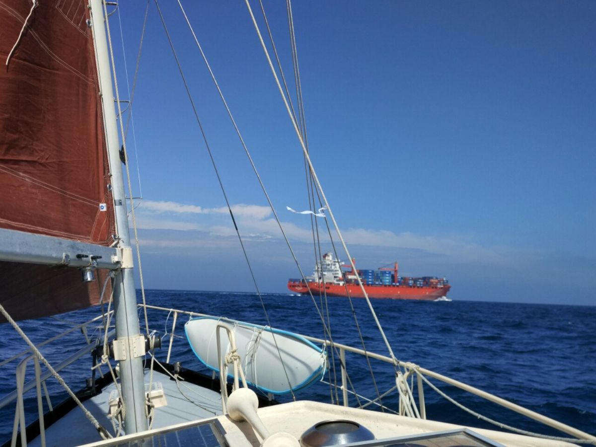 Mit Anbruch des Tageslichts gibt es wieder Wind, leichter Nord-West, also genauso aus der Richtung, in die wir segeln möchten. Kein Land mehr in Sicht, wir halten weiter von der Küste weg. Ein riesiges Container-Schiff kreuzt unseren Kurs von backbord nach steuerbord, vermutlich auf dem Weg nach Lissabon. Sieht aus, wie eine Stadt auf dem Wasser. Nur eine Stunde später passiert ein weiteres Container-Schiff in derselben Linie knapp vor uns. Es schiebt eine gewaltige Bugwelle vor sich her, so dass auch unsere Bewegungen etwas ungemütlich werden. Vorsichtshalber schalte ich das Funkgerät an, aber Keiner spricht uns an. Spannende Augenblicke, bis der Riese eindeutig vorbei gezogen ist.