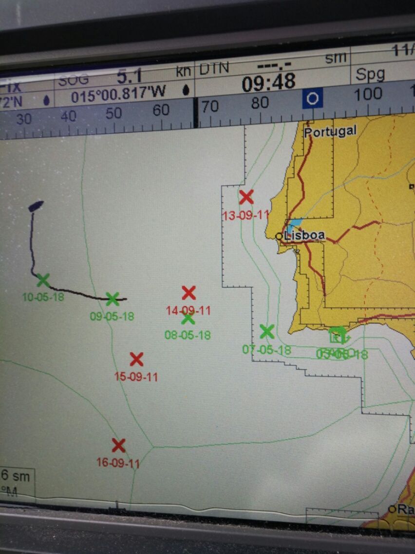 Über Nacht wurden wieder unsere Batterien leer gelutscht. Unsere Positionslampe, der Dreifärber im Top, hat einen enormen Energieverbrauch. Morgens reicht der Strom nicht mehr zum Funken. Wir müssen den Motor im Leerlauf mitlaufen lassen, um die Batterien zu laden, wenn wir nicht den Lärm des Windbaggers aushalten wollen. Mit diesem Zustand können wir auf Dauer nicht leben. Im September wird der Mast gelegt, dann gibt es ein neues Rigg auf’s Schiff und neue Lampen, die nicht so viel Strom fressen. Außerdem haben wir unsere gute Solar-Paneele vom alten Boot mit der Spedition verschifft, die wird Einiges zusätzlich an Energie liefern. Am Nachmittag klappt eine erste Funk-Verbindung mit Intermar. Wir bekommen einen detaillierten Wetterbericht und die Bestätigung, dass es richtig ist, den Kurs stur weiter nach Westen zu halten. Entlang der Küste gibt es nur Wind aus Nord, Nord, Nord …. Je näher an Land, umso heftiger. Das soll auch die nächste Zeit noch so bleiben. Immerhin hat uns die gewählte Richtung bereits aus der Starkwind-Zone herausgebracht, in etwa zwei Tagen sollten wir die Nordwind-Region hinter uns haben. Bis dahin heißt es : Bananen essen. 😉 Am Donnerstag in Faro im Supermarkt eingekauft, wo man keine Wahl hat zwischen essbereiten und grünen Stauden. Nun sind sie alle gleichzeitig reif. Das bedeutet, mindestens 3-4 Bananen am Tag für Jeden. Ein kleiner Rest wird dann wohl trotzdem noch über Bord gehen.