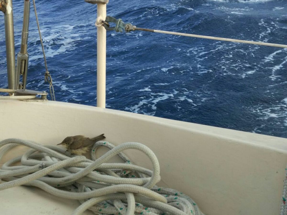 Nochmalige Kontrolle von Rigg und Leinen – sieht alles gut aus. Mit vollem Großsegel, Klüver und Fock auf backbord läuft das Boot sehr gut. Kurs West, nicht perfekt, aber das können wir in den nächsten Tagen korrigieren. Am Nachmittag nimmt der Schiffsverkehr immer mehr zu. Ein weiterer Grund, lieber von der Küste wegzusteuern. Weiter draußen auf See haben wir mehr Platz. Wir fühlen uns sehr wohl damit, wenn wir tage- und wochenlang nur Wasser um uns herum sehen. Ein kleiner Vogel kommt bis ins Deckshaus geflogen, setzt sich auf’s Steuerrad und ruht sich eine Weile aus. Irgendwann wagt sich der hübsche Piepmatz sogar bis in den Salon und macht es sich nach einem Erkundungsflug in unserem Bett gemütlich. Aus dem Schlafzimmer wird er schnellstmöglich wieder vertrieben, ansonsten kann er gerne mitfahren.