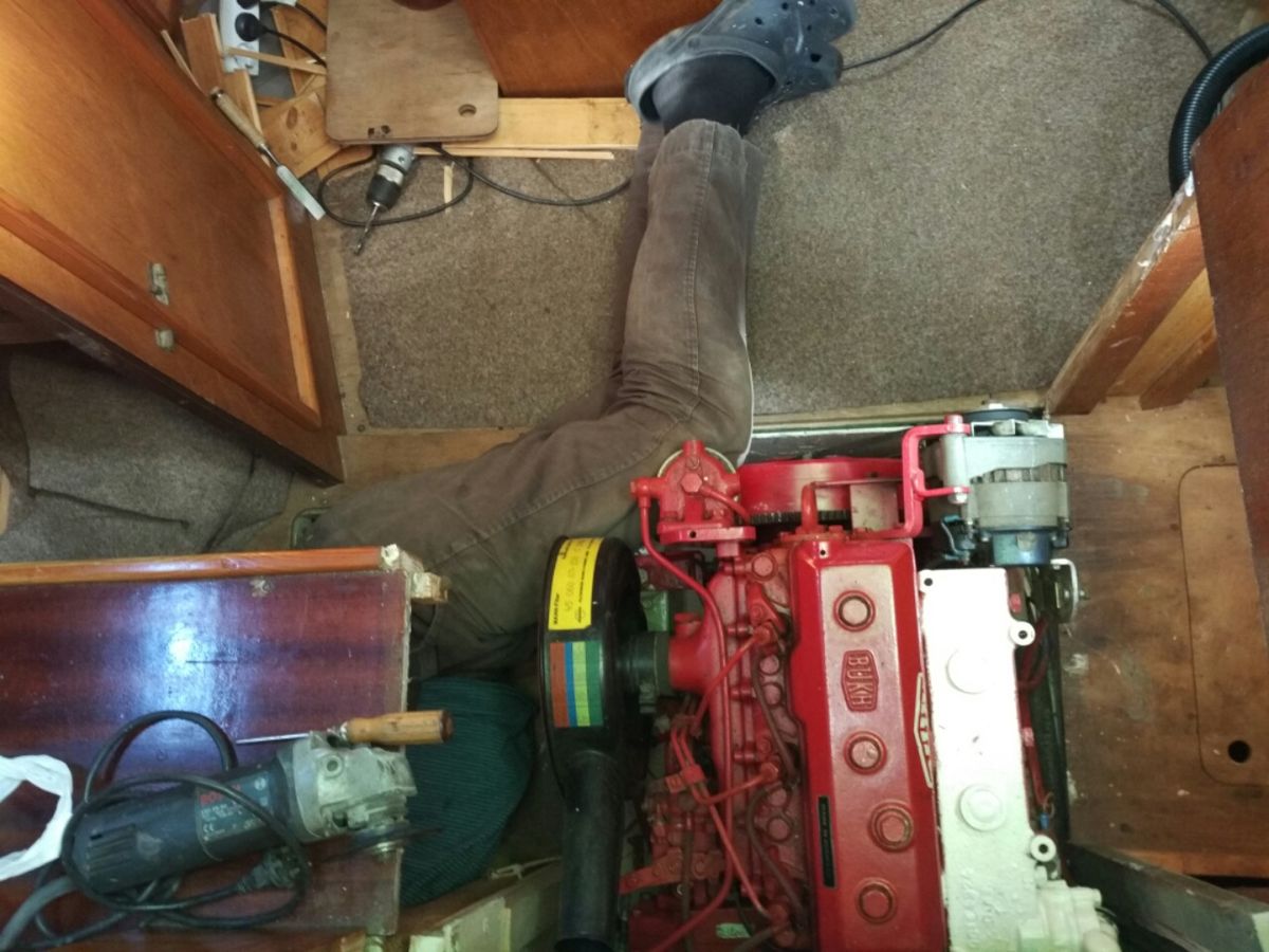 Es gibt Ersatzteile an Bord, die wir einfach nicht zuordnen können. Ein Dieselfilter, der anscheinend nicht passt. Ein Reparatur-Kit für eine Pumpe, die nicht ( mehr ?) existiert. Und wohin gehört bitteschön die Anode für den Motor ? Ich bewundere meinen Mann für seine unendliche Geduld und Geschicklichkeit. <3 Ich selber habe hier zur Zeit eher eine Statisten-Rolle : Anwesend sein, Kaffee kochen, Handlanger-Dienste .... und noch einmal die große Deutschland-Fahne nähen. Die muss durchhalten bis zu Hause.