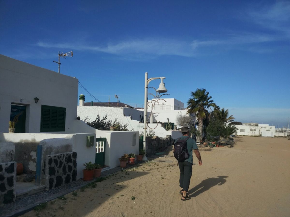 La Graciosa ist die nördlichste bewohnte Insel der Kanaren. Insgesamt nur 29 km² Fläche, 700 Einwohner, also sehr überschaubar. Das Dorf Caleta de Sebo liegt knapp eine Stunde Fußmarsch entfernt von unserem Ankerplatz. Ein Ort, der in den Sand gebaut wurde, so richtig urig und verschlafen. Zwei kleine Lebensmittel-Läden, eine Eisdiele und drei Cafés, das Angebot ist völlig ausreichend. Duschen können wir auf dem öffentlichen Campingplatz, kaltes Wasser und draußen.