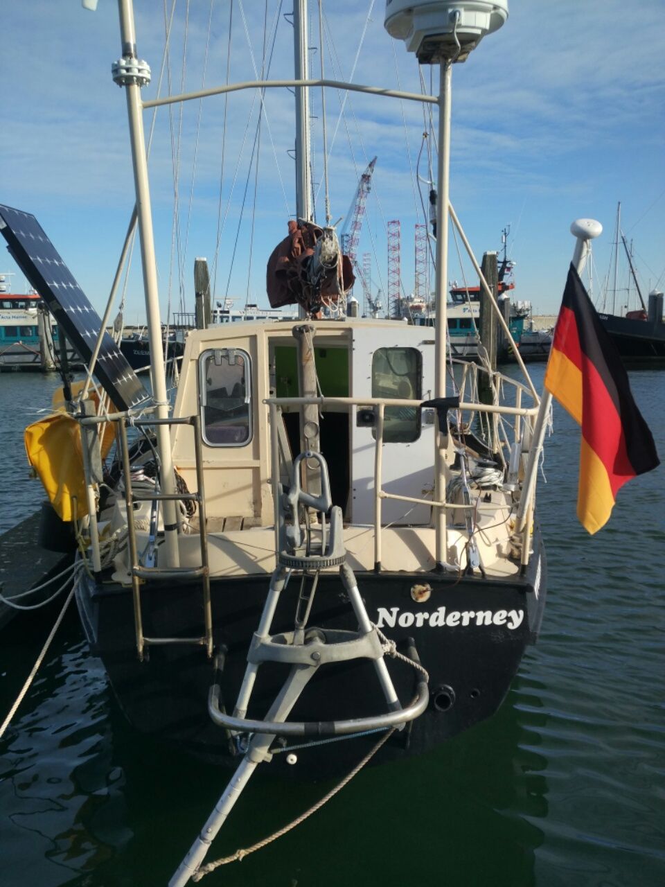 Nachmittags setzen wir das gereffte Groß und dazu den Bullenstander in Luv. Um 16.30 Uhr geht im Westen die Sonne als glutroter Ball unter. Es liegen 15 Stunden Dunkelheit vor uns, mehr Tageslicht kann man Mitte November nicht erwarten. Aber ein strahlend heller Halbmond steht am Himmel und erleuchtet auch das Wasser. Milliarden von Sternen funkeln, Sternschnuppen fallen. 🙂 Der Wind frischt auf, die Fock wird verkleinert. Mit 5-7 Knoten Fahrt und ohne besondere Vorkommnisse segeln wir nahe entlang der niederländischen Küstenlinie. Unsere erste Nachtwache verläuft völlig entspannt, wenn auch sehr kalt. Wir sind müde, finden noch nicht so recht in unseren Rhythmus und verkürzen die Wachen. Egal, denn es ist sowieso noch eine Unterbrechung in Holland geplant. Am Sonntag gegen 11.00 Uhr machen wir nach 150 Seemeilen die Leinen im Hafen von Ijmuiden fest. Der Ort strahlt nicht vor Schönheit, aber hier ist ein Treffen mit Rabinath geplant, den wir 2017 auf dem Continental Divide Trail kennengelernt haben.